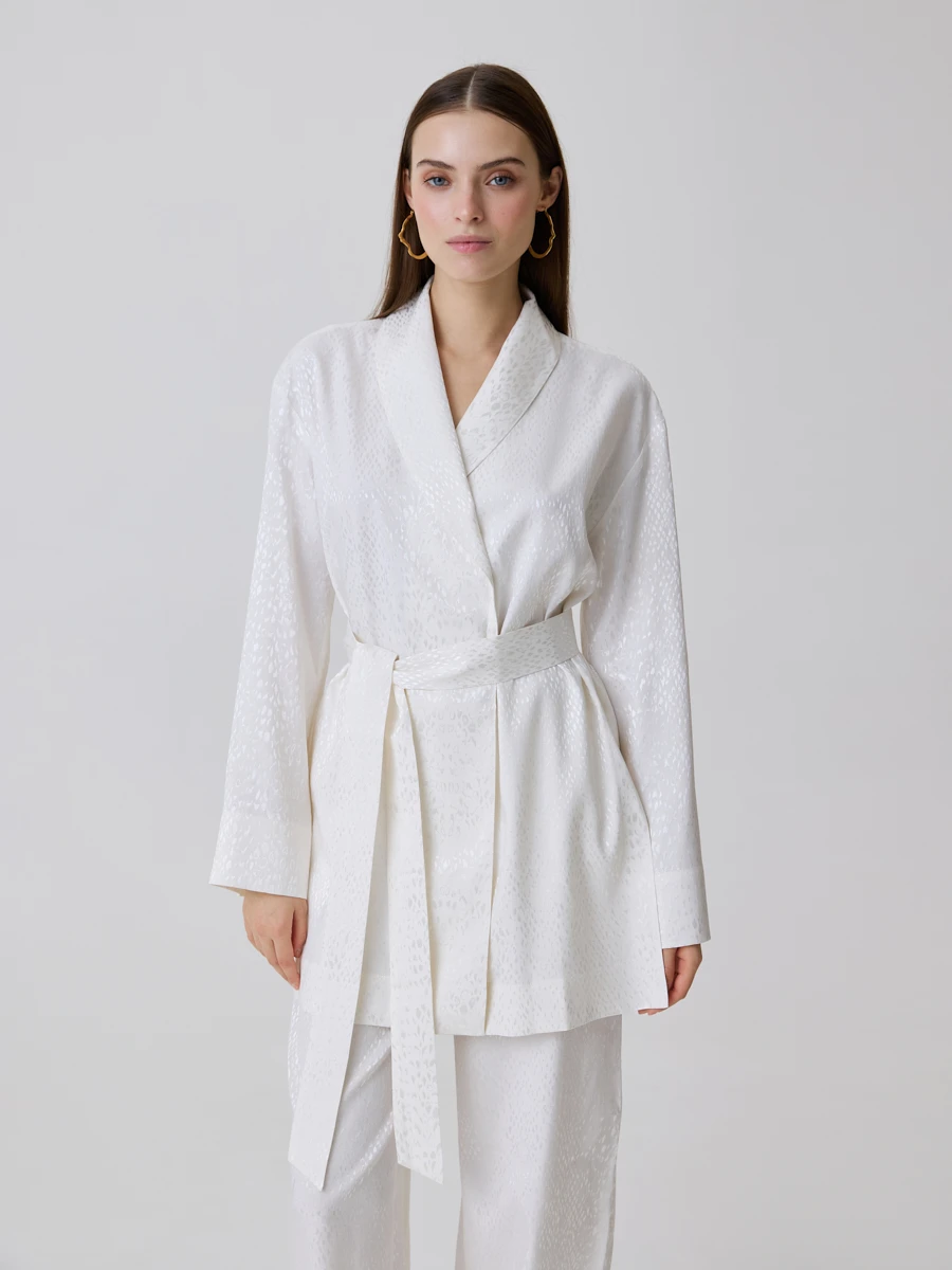 Легкая свободная блуза в японском стиле в приятном молочном оттенке. Отличительная особенность изделия - сатиновый принт змеиной кожи. На свету рисунок переливается деликатным блеском и придает праздничный характер наряду. Натуральные ткани в составе делают модель идеальным вариантом в период высоких температур. По бокам проходят глубокие акцентные разрезы. В комплекте идет широкий съемный пояс. С его помощью можно создать акцент на талии и разнообразить образ.