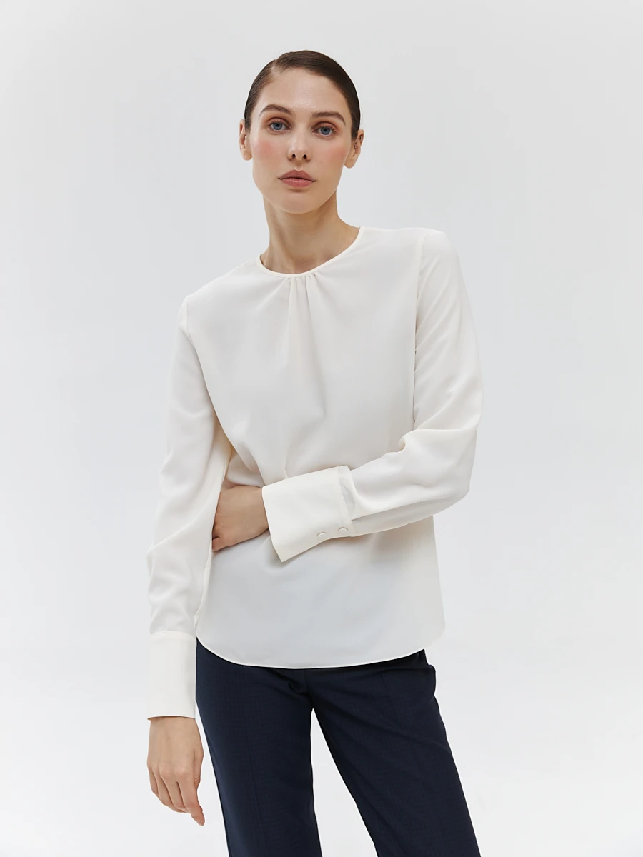 Тонкая и нежная блуза прямого кроя замечательно впишется в любой деловой гардероб. Горловина со сборкой создает акцентный элемент, не привлекая к себе слишком много внимания, а широкие манжеты на рукавах подчеркнут узкие запястья. ¶¶• прямой силуэт¶• втачной рукав полной длины¶• широкие манжеты¶• круглая горловина со сборкой¶• застежка-”капелька” (потайная петля и пуговица) сзади