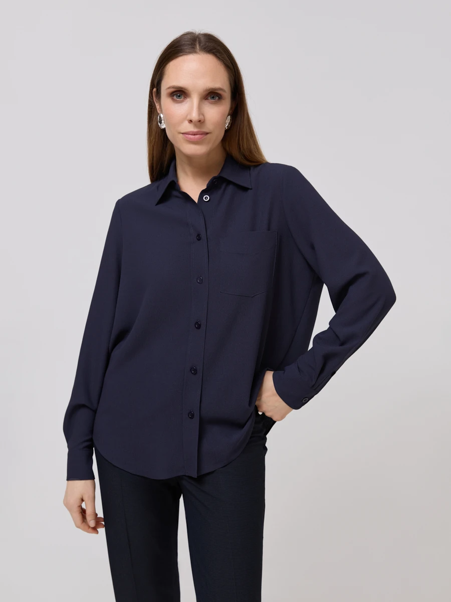 Базовая рубашка прямого кроя из смесового материала с добавлением вискозы. Модель с отложенным воротником на стойке, манжетами, дополнена карманом .