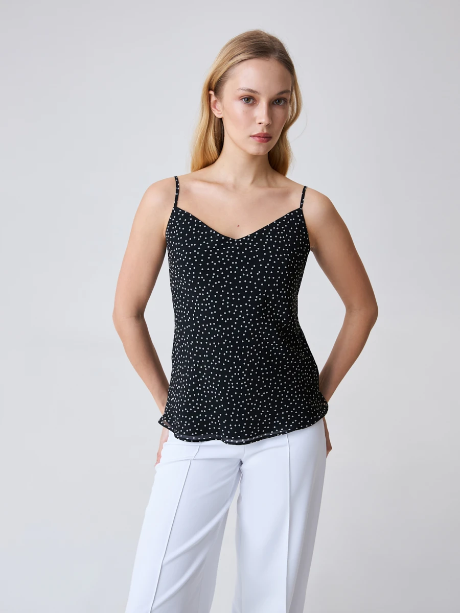 Легкая женственная блуза на тонких лямках в черном цвете с белым горошком. Модель полуприлегающего силуэта подойдет на любой тип фигуры и будет гармонично сочетаться с большим количеством вариантов низа. Элегантный V-образный вырез делает акцент на зоне декольте и ключицах. Универсальная длина по бедра позволяет носить блузу в заправленном виде с брюками и юбкой на любой посадке и составлять стильные образы под разное настроение.