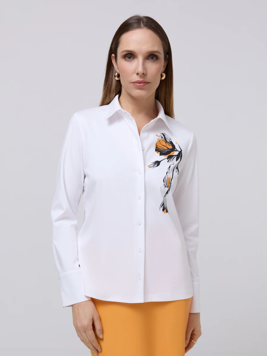 Эта женская блуза приталенного кроя выполнена из 100% мерсеризованного хлопка, обеспечивая исключительную мягкость, гладкость и деликатный блеск. Белый цвет модели делает её универсальной основой для делового и повседневного гардероба, а акцент в виде выразительного флористического принта на груди придаёт образу свежесть и индивидуальность. Прямой воротник и манжеты на пуговицах подчеркивают аккуратный силуэт и делают блузу актуальной в сочетании с классическими брюками или юбкой.