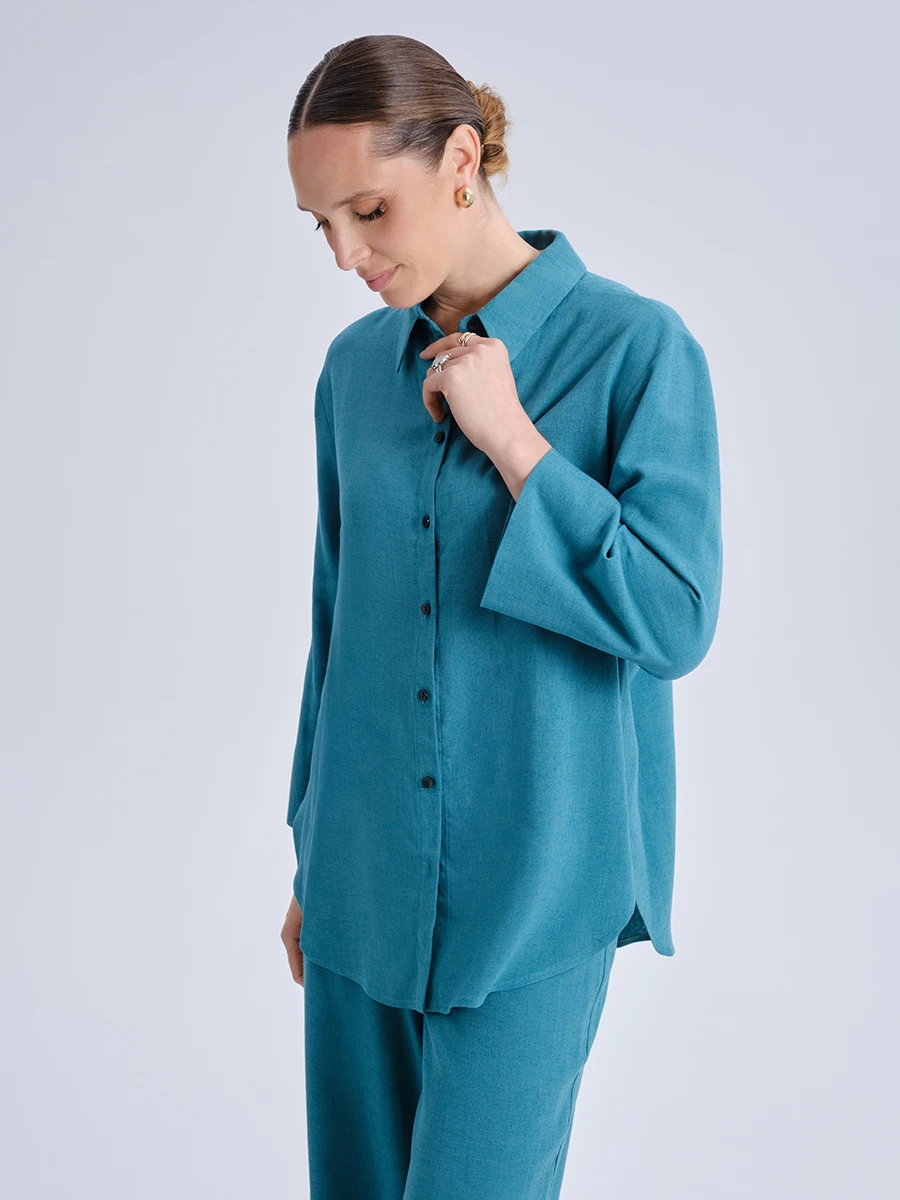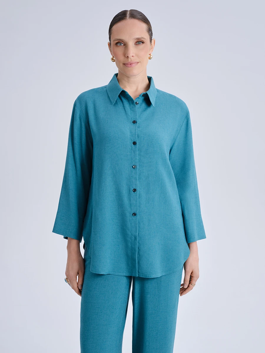 Бирюзовая рубашка прямого кроя — универсальная модель, сочетающая комфорт и элегантность. Свободный силуэт с классическим отложным воротником и ровной линией плеч создаёт расслабленный, но собранный образ. Удлинённый фасон с закруглённым низом визуально вытягивает силуэт и делает рубашку особенно удобной для повседневной носки. Застёжка на контрастные пуговицы добавляет лаконичные акценты, а широкие рукава 3/4 подчеркивают непринуждённый стиль.¶¶Смесовая ткань из вискозы и льна приятна на ощупь, хорошо дышит и сохраняет аккуратный вид в течение дня. Натуральные волокна обеспечивают комфорт даже в жаркую погоду, а плотное полотно держит форму без утраты мягкости. Эта модель легко вписывается как в деловой гардероб, так и в более расслабленные повседневные образы — достаточно дополнить её брюками прямого кроя или заправить в юбку средней длины.