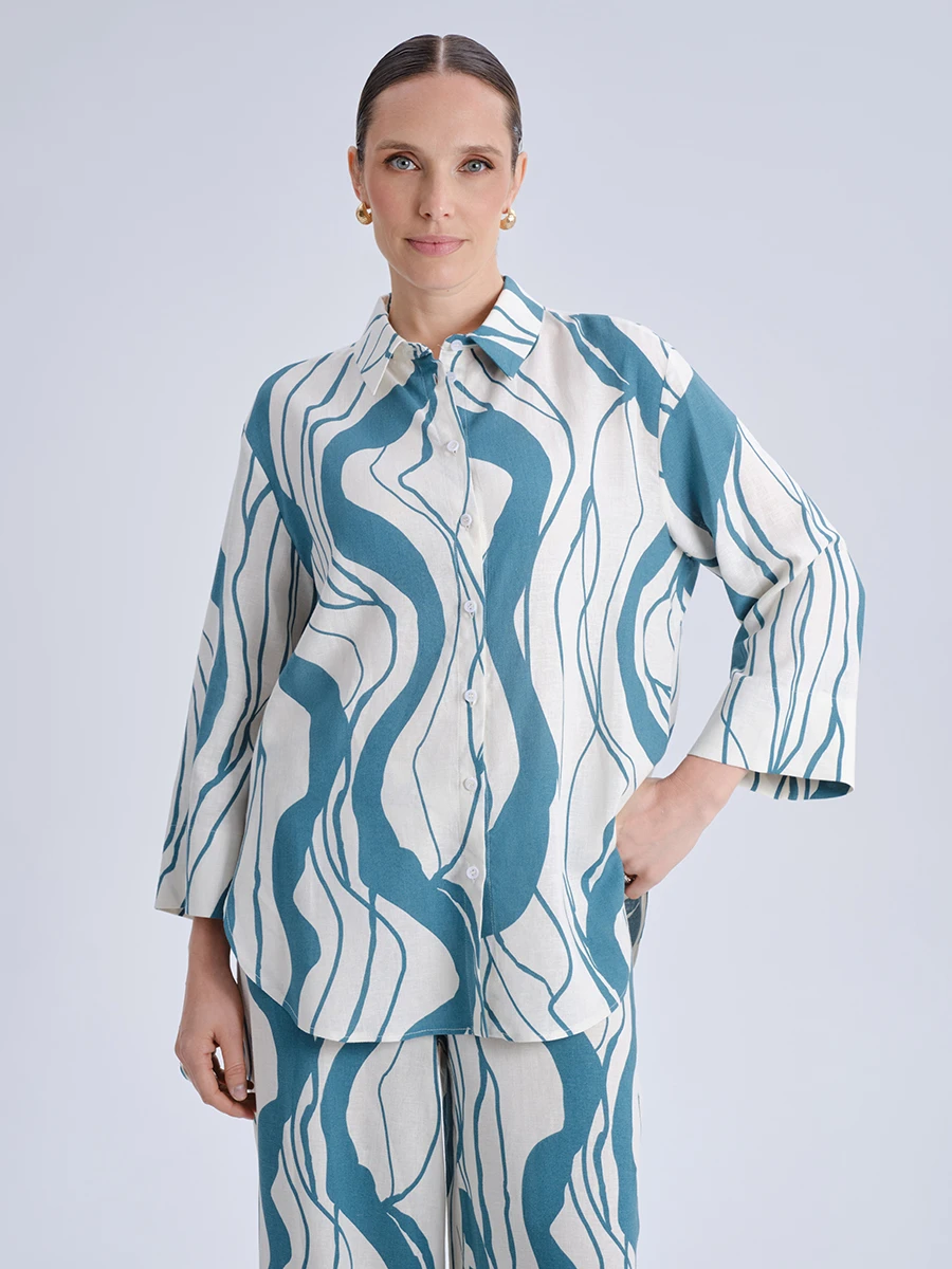 Рубашка прямого кроя с бирюзовым абстрактным рисунком — универсальная модель, сочетающая комфорт и элегантность. Свободный силуэт с классическим отложным воротником и ровной линией плеч создаёт расслабленный, но собранный образ. Удлинённый фасон с закруглённым низом визуально вытягивает силуэт и делает рубашку особенно удобной для повседневной носки. Застёжка на контрастные пуговицы добавляет лаконичные акценты, а широкие рукава 3/4 подчеркивают непринуждённый стиль.¶¶Смесовая ткань из вискозы и льна приятна на ощупь, хорошо дышит и сохраняет аккуратный вид в течение дня. Натуральные волокна обеспечивают комфорт даже в жаркую погоду, а плотное полотно держит форму без утраты мягкости. Эта модель легко вписывается как в деловой гардероб, так и в более расслабленные повседневные образы — достаточно дополнить её брюками прямого кроя или заправить в юбку средней длины.