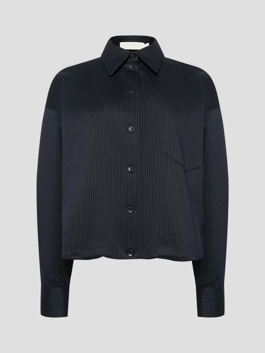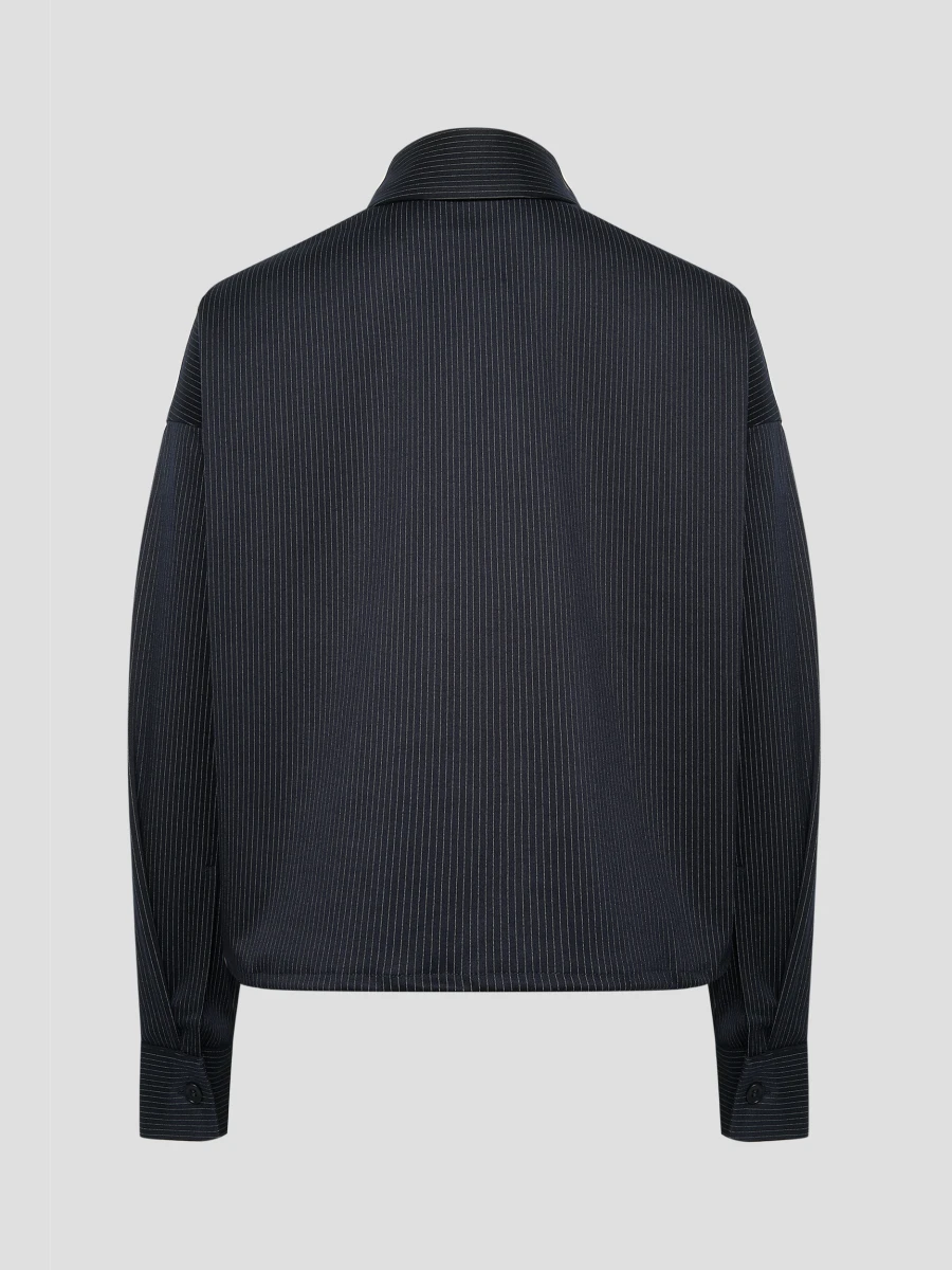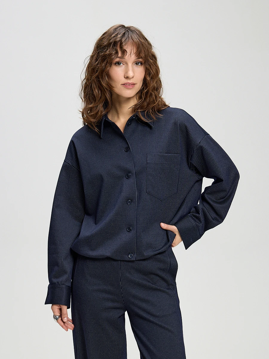Эта стильная рубашка имеет современный крой, напоминающий классический бомбер — слегка свободный, с акцентом на плечах и спущенным рукавом. Элегантный синий принт в вертикальную полоску визуально вытягивает силуэт, делая его более стройным и динамичным. Кулиска по низу рубашки обеспечивает идеальную посадку, комфорт и позволяет создать аккуратный, слегка присборенный силуэт.