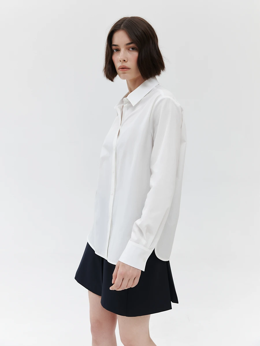 Базовая рубашка прямого силуэта с актуальной формой воротника создает безукоризненный образ и может быть как частью делового гардероба, так и самостоятельным элементом в иных ситуациях. Кокетка на спинке и прорезные петли на цельнокроенной планке подчеркивают фигуру, а фигурная линия низа делает образ чуть более расслабленным.