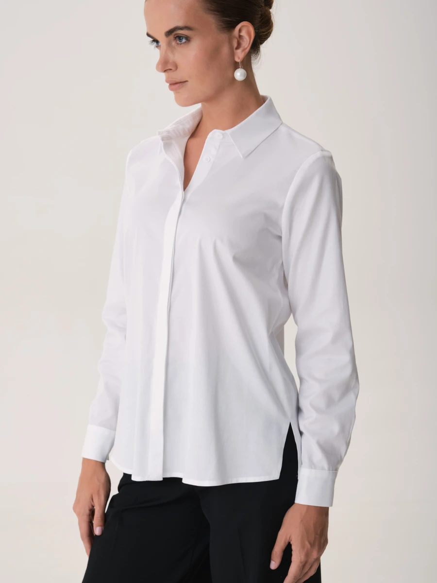 Базовая прямая рубашка свободного кроя в белом цвете - незаменимая единица любого гардероба. Данная модель выполнена из легкой хлопковой ткани премиального качества и отлично подойдет для стильных образов в жаркую погоду. Лаконичный дизайн делает изделие универсальным и практичным. Рубашка застегивается на потайной ряд круглых белых пуговиц - актуальный прием в духе минимализма.