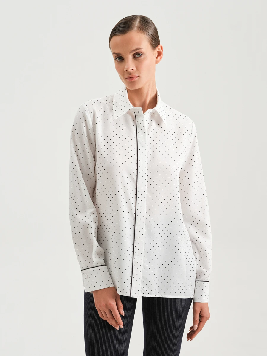 Базовая классическая рубашка цвета слоновой кости с женственным принтом в мелкий горошек. Лаконичный дизайн модели позволяет стилизовать большое количество нежных элегантных образов. Потайной ряд пуговиц и широкие манжеты украшены тонкими контрастными строчками черного цвета. Изделие выполнено из легкой дышащей ткани. Приятно ложится к телу, комфортно носится на протяжении всего дня и отлично ведет себя при стирке. Можно создать стильный многослойный образ и надеть поверх объемный свитер крупной вязки.