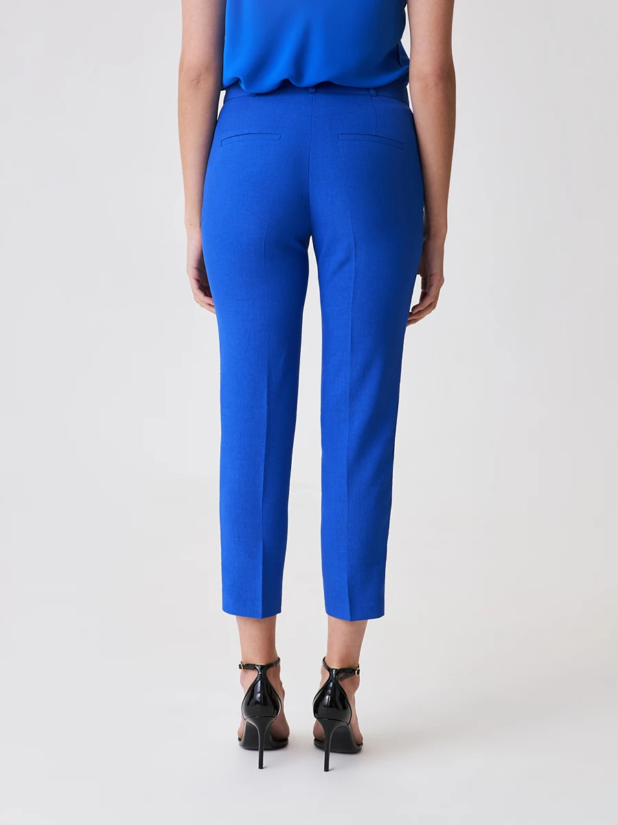 Женские брюки из фактурного материала яркого оттенка electric blue внесут свежесть и новизну в сдержанный деловой дресс-код. Высокий притачной пояс и зауженные штанины подчеркивают стройность фигуры, формируя гармоничный силуэт. Сочетание брюк и базовой блузы создаст интересный комплект для официальной встречи или праздничного мероприятия.