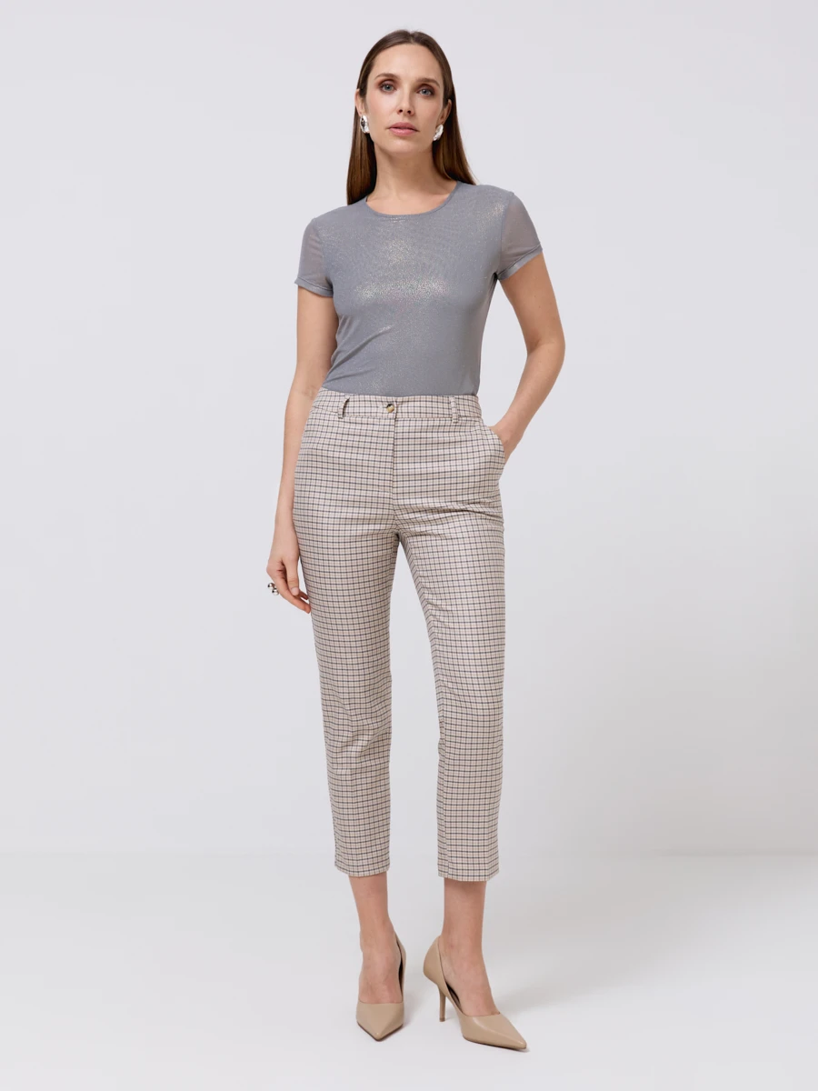 Брюки укороченные прилегающего кроя из костюмной ткани в клетку. Дополнены боковыми карманами.