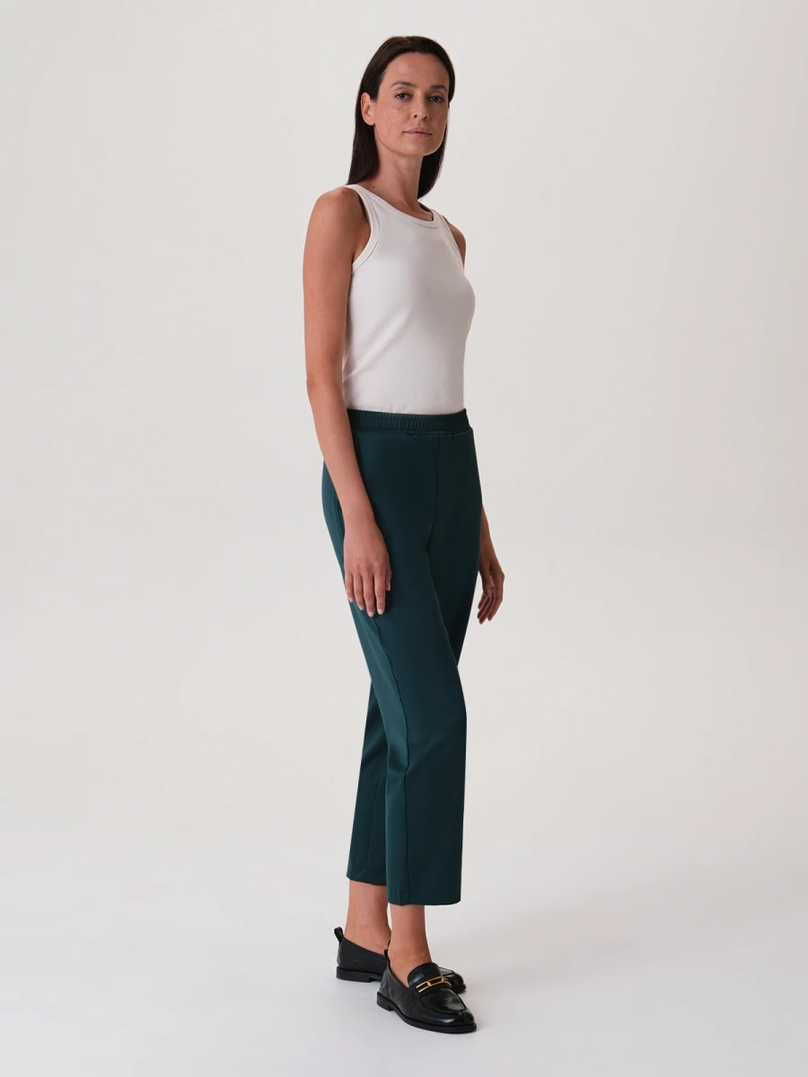 Брюки укороченной длины, зауженные к низу. Посадка на талии, пояс на резинке. Изделие дополнено боковыми карманами. Брюки выполнены из смесовой ткани с добавлением волокон вискозы, ткань хорошо держит форму и сохраняет цвет.