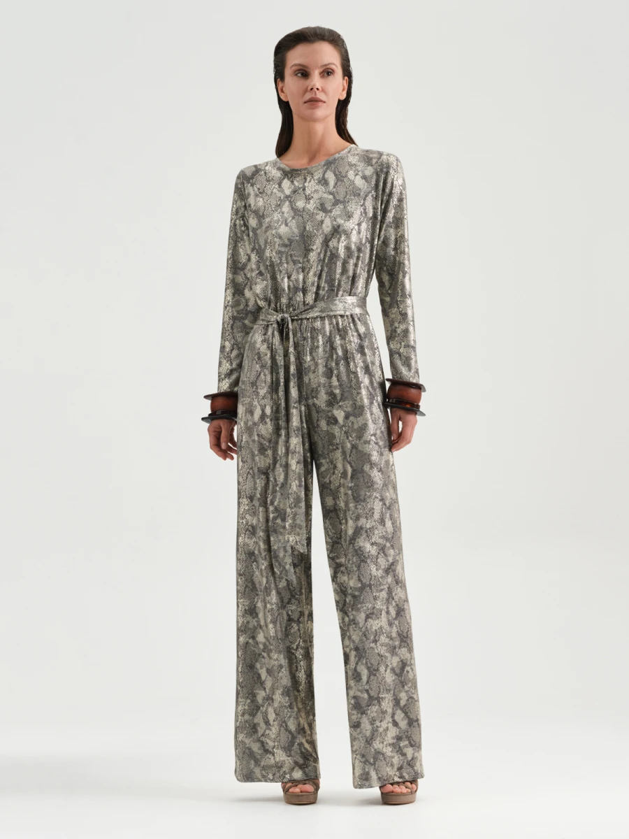 Роскошный комбинезон из струящейся трикотажной ткани с трендовым анималистичным принтом. Преимущество данного наряда заключается в том, что он легко сочетается с обувью и позволяет экспериментировать с аксессуарами. В комплекте идет длинный съемный пояс, с помощью которого можно подчеркнуть талию и создать силуэт «песочные часы». V-образный вырез сзади демонстрирует красоту спины, а тонкие завязки делают образ более нежным и женственным.
