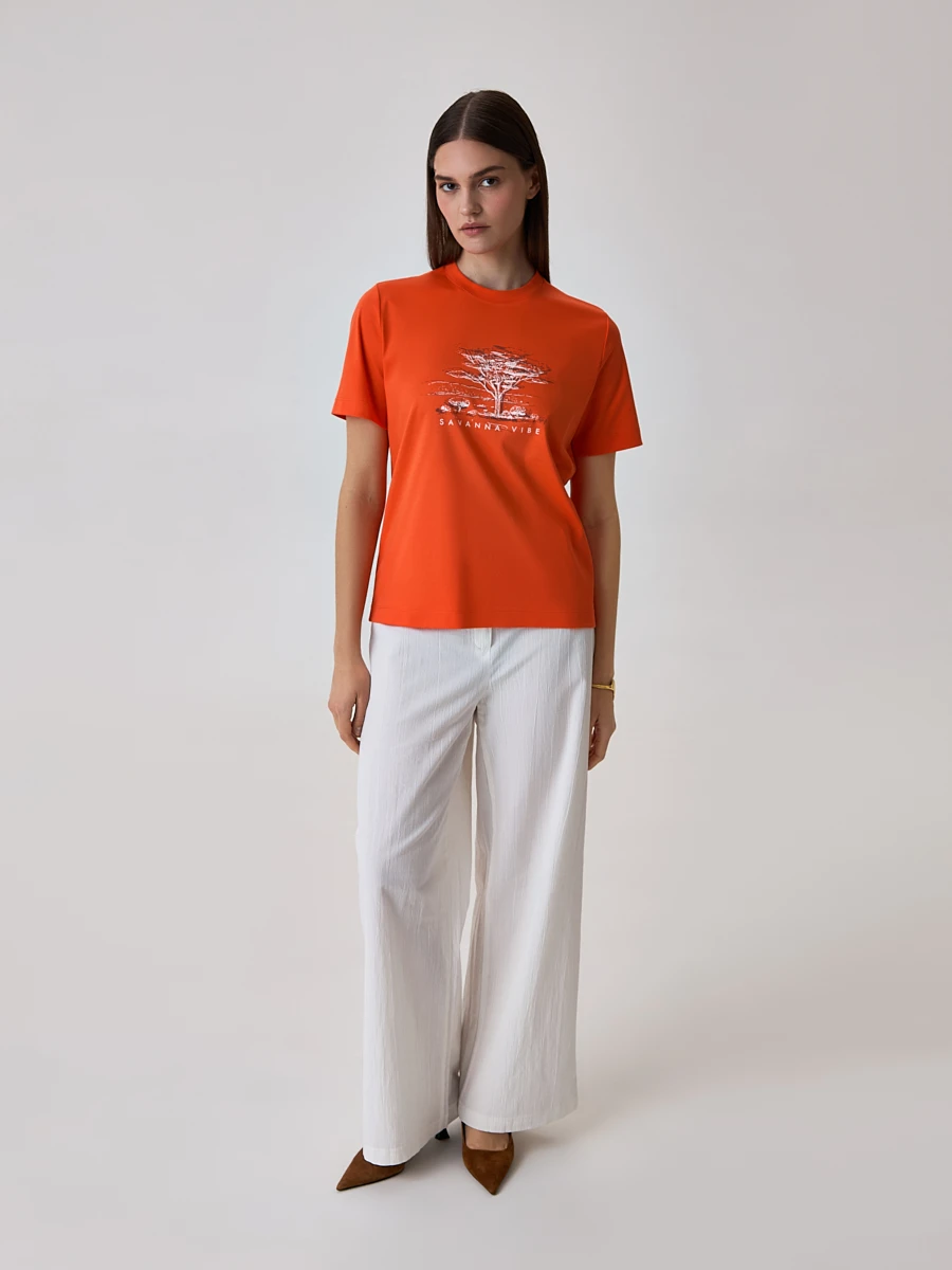 Свободные прямые брюки из хлопка - идеальный вариант в жаркую погоду. Данная модель выполнена из легкой фактурной ткани, приятной к телу и практичной в носке. Пояс на высокой посадке оснащен шлевками для ремня, а на задней части имеются вытачки для гармоничного силуэта. Универсальный прямой крой и полная длина позволяют сочетать брюки с большим количеством вариаций обуви. Можно собрать романтический образ с босоножками или туфлями на шпильке или более повседневный лук с кедами на плоской подошве.