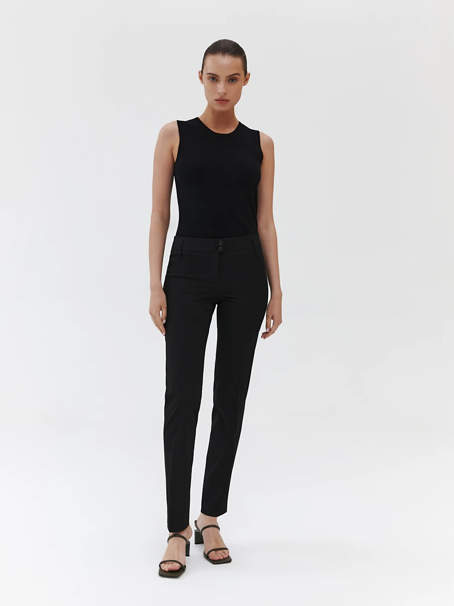 Зауженные брюки черного цвета на средней посадке со стрелками. Выполнены из комфортной ткани средней плотности, подойдут на прохладную погоду. Идеальны для делового образа.