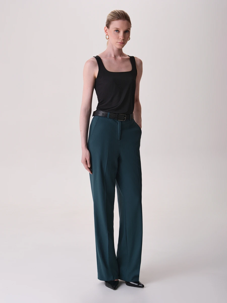 Классические брюки на высокой посадке выполнены из плотной костюмной ткани высокого качества темно-бирюзового цвета. Благодаря особенностям кроя модель идеально садится по фигуре, подчеркивая талию и формируя гармоничный силуэт. По периметру пояса расположены шлевки для ремня, спереди имеются вместительные функциональные карманы, а сзади декоративная прямоугольная строчка. Заутюженные стрелки по всей длине создают вертикальные линии и визуально корректируют фигуру.