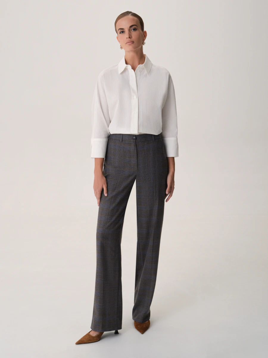 Классические брюки в клетку на высокой посадке - универсальный вариант для строгих деловых образов. Свободный прямой крой в сочетании с заутюженными стрелками по всей длине визуально вытягивает силуэт и стройнит фигуру. Спереди имеется вместительные функциональные карманы, а по периметру пояса расположены шлевки для ремня. Застегиваются брюки на пуговицу и потайную молнию.