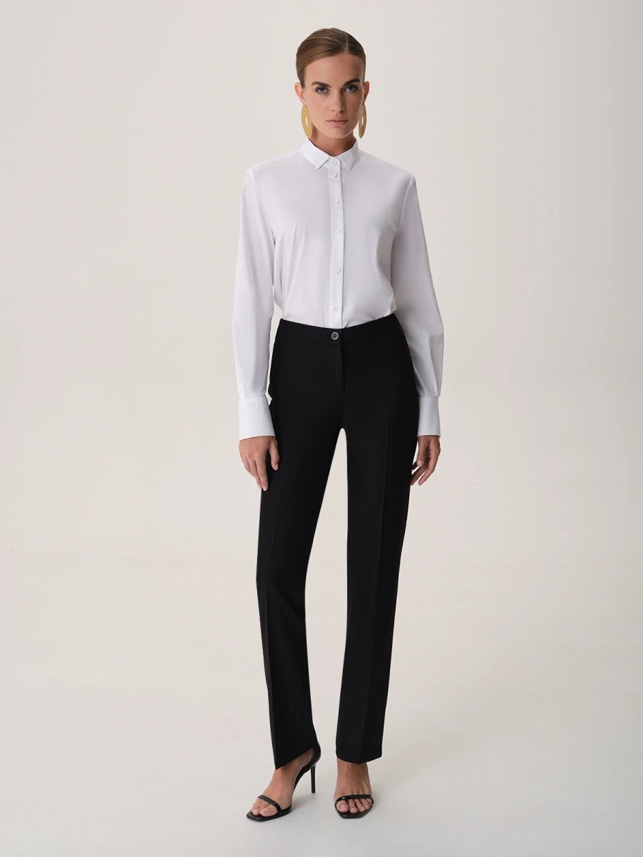Строгие классические брюки зауженного кроя идеально впишутся в деловой гардероб для стильных официальных образов. Модель выполнена из плотной костюмной ткани премиального качества в черном цвете. Пояс на высокой посадке создает акцент на талии, а вытачки сзади визуально округляют бедра. По всей длине проходят вертикальные заутюженные стрелки, которые вытягивают и стройнят силуэт.