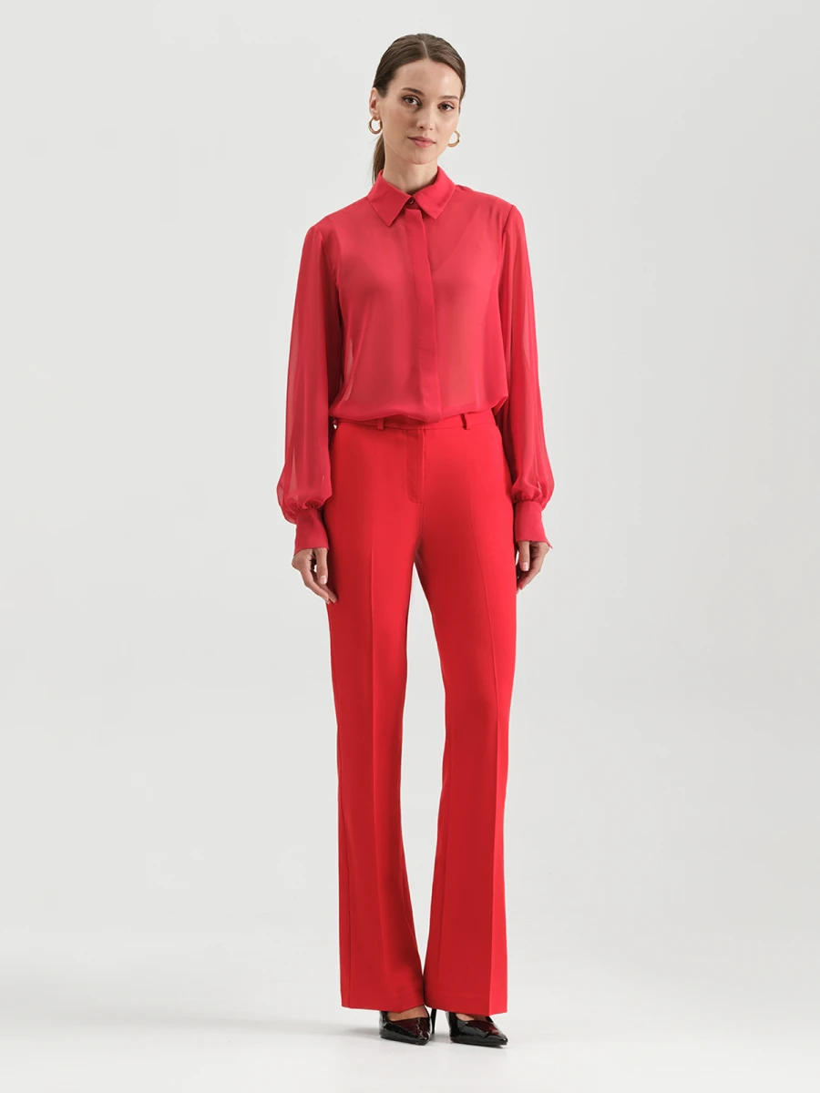 Для любительниц ярких цветов и смелых сочетаний дизайнеры нашего бренда разработали данную модель брюк в насыщенном красном цвете. Высокая посадка подчеркивает талию, а легкий клеш от колена и вертикальные стрелки создают стройный вытянутый силуэт. По периметру пояса расположены шлевки для ремня. Спереди и сзади имеются декоративные карманы. Застегиваются брюки на пуговицу в цвет и потайную молнию.