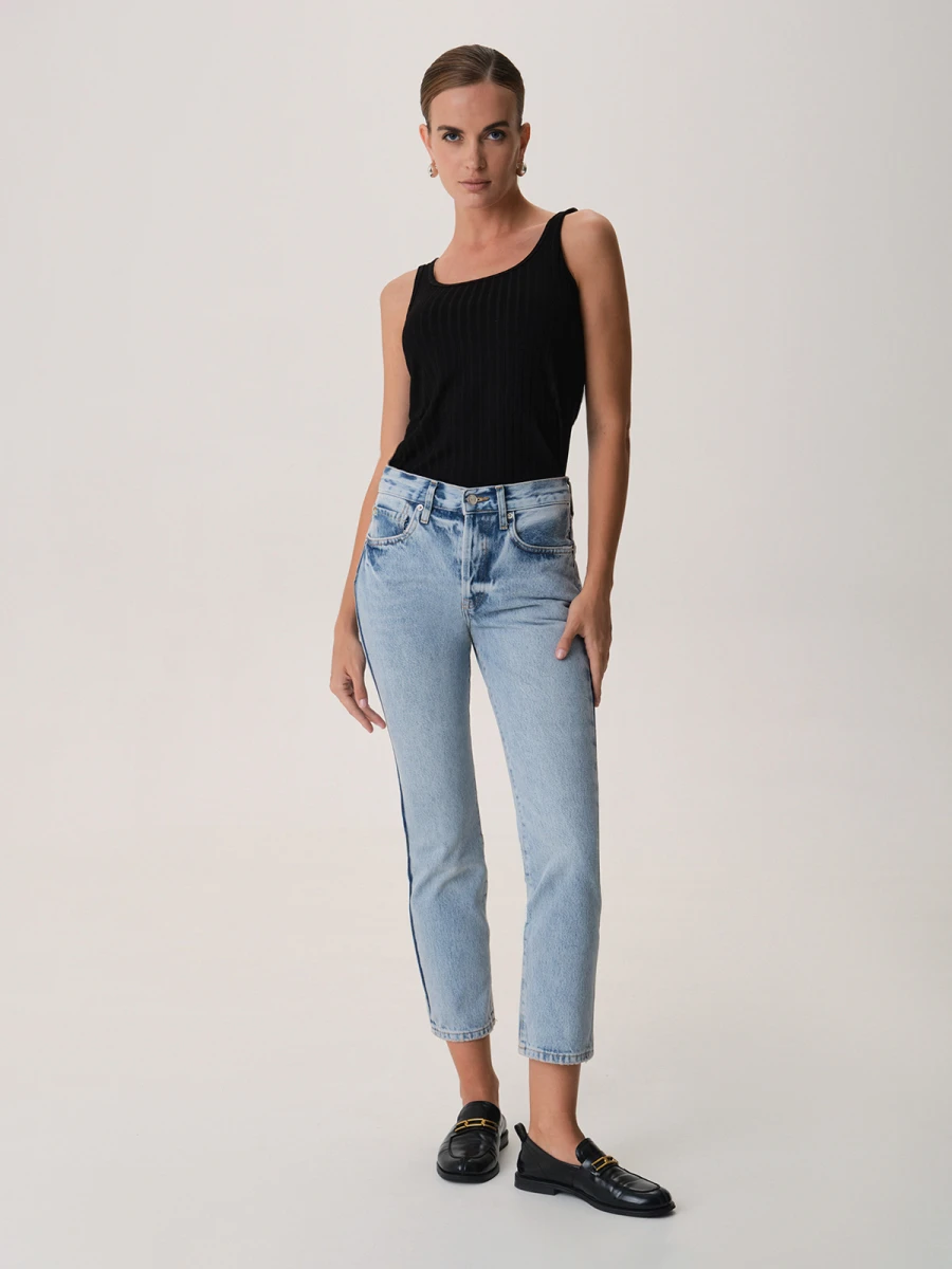 Светло-голубые джинсы прямого кроя станут незаменимой базой в вашем повседневном гардеробе. Отличительная особенность данной модели - темные вертикальные полоски вдоль всей длины по бокам. Анатомическая средняя посадка обеспечивает полный комфорт при ношении - можно сочетать с заправленными внутрь футболками и рубашками или носить навыпуск. Укороченная длина открывает щиколотки, спереди и сзади имеются вместительные карманы.