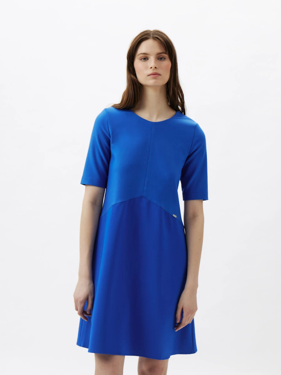Полуприлегающее платье из легкой ткани синего цвета.