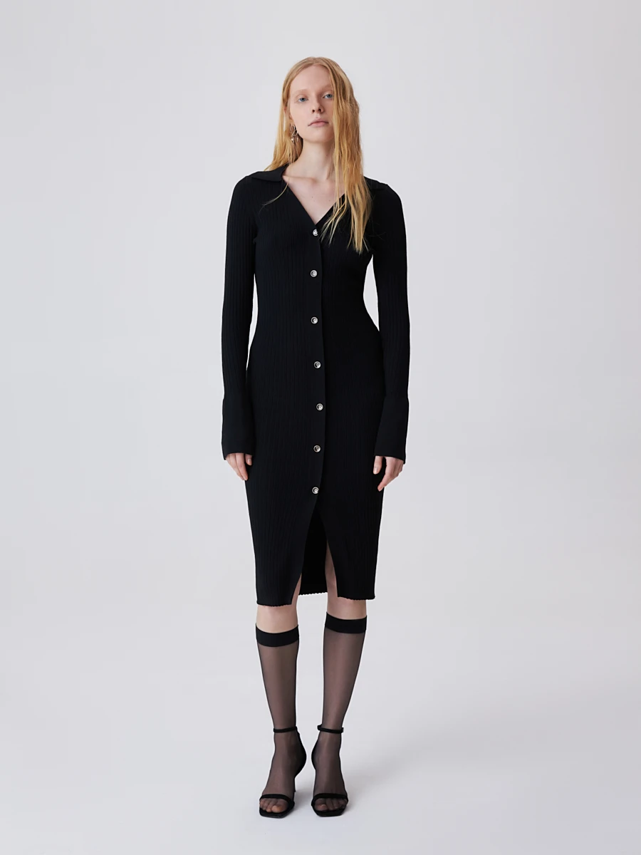 Платье мелкой вязки прилегающего силуэта с длинными рукавами. Актуальная модель выполнена в длине до колен и спереди имеет разрез до середины бедра. Универсальный черный цвет в союзе с лаконичным дизайном позволяют легко интегрировать изделие в любой гардероб для стильных женственных образов. Аккуратный V-образный вырез делает акцент на шее и ключицах. Вдоль платья проходит ряд блестящих круглых пуговиц.