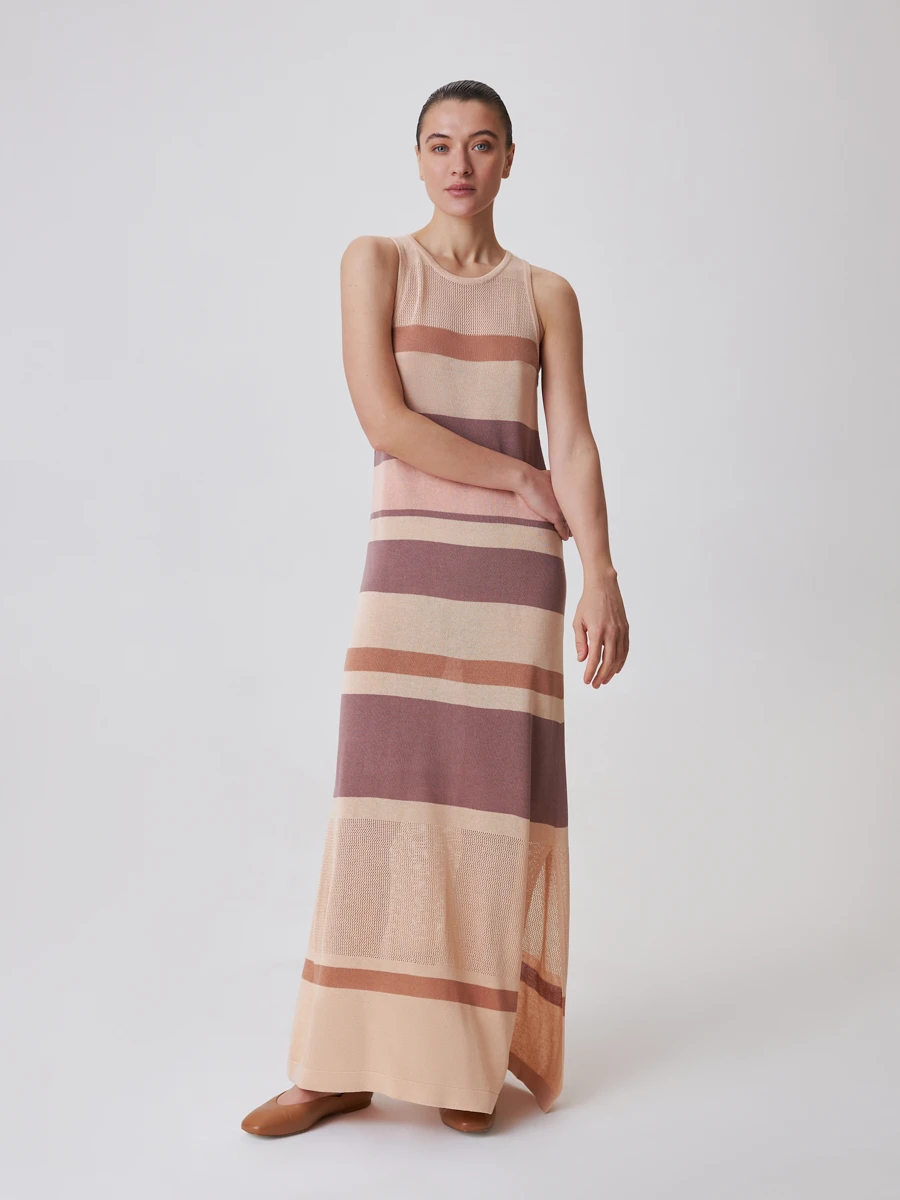 Данная модель вязаного платья макси никогда не оставит без внимания его обладательницу. Особенности кроя и грамотно подобранный рисунок позволяют расставить правильные акценты и создают гармоничные пропорции. Глубокие разрезы по бокам изделия при шаге делают образ более воздушным и легким. Широкие лямки и горловина обработаны специальным швом. Это позволяет комфортно носить платье в течение дня и свободно двигаться, не чувствуя скованности.