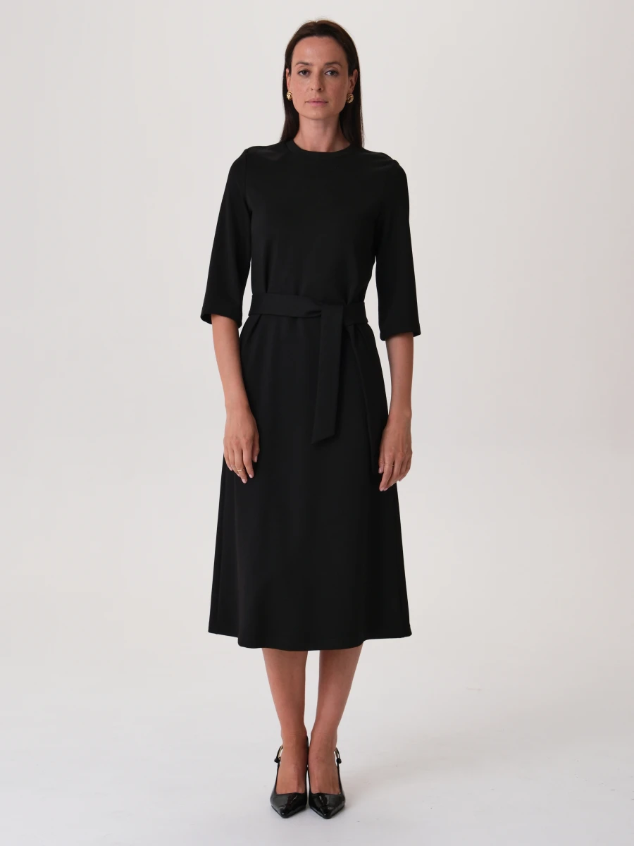 Базовое трикотажное платье в черном цвете - идеальное сочетание стиля и практичности. Универсальная модель полуприлегающего силуэта выполнена в длине миди с рукавами 3/4. В комплекте имеется длинный пояс в цвет изделия, с помощью которого можно расставлять акценты по фигуре. Платье станет основой для большого количества образов под разное настроение. В сочетании со строгими жакетами - для деловых встреч. А с яркими объемными свитерами - для вечерних прогулок.