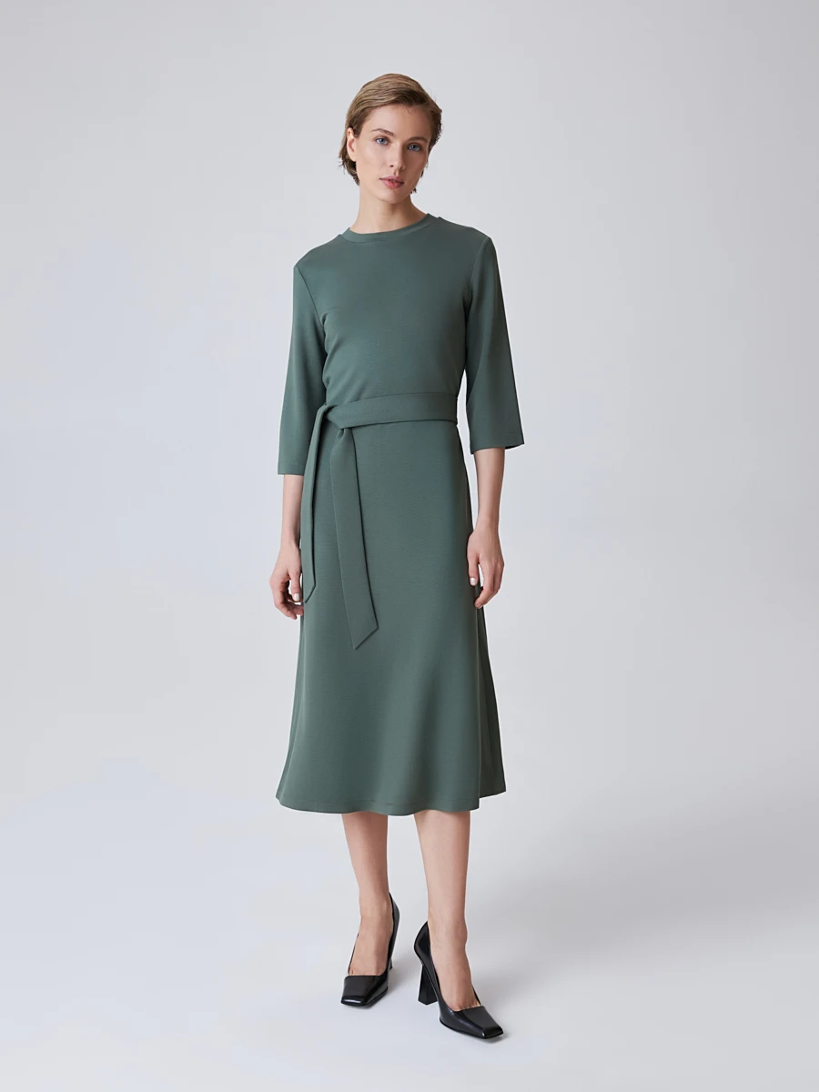 Однотонное трикотажное платье длины миди выполнено в хвойном зеленом оттенке. Мягкий струящийся трикотаж комфортно ложится к телу и отдает деликатным блеском на свету. Длинный съемный пояс в комплекте подчеркивает талию и формирует силуэт песочные часы, тем самым делая образ еще более женственным и утонченным. Свободные рукава в длины ниже уровня локтей открывают руки и демонстрируют красоту запястья. Такое платье не оставит его обладательницу незамеченной ни на одном мероприятии.