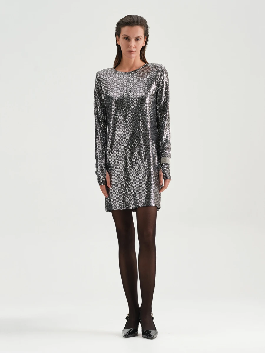В таком наряде вы точно станете звездой любой вечеринки. Роскошное платье в длине мини выполнено из блестящей серебристой ткани. Длинные рукава до середины ладони оснащены прорезями для больших пальчиков - один из самых популярных трендов последних сезонов. Несмотря на особую фактуру ткани, платье приятно ложится к телу и комфортно носится на протяжении всего дня. Лаконичный прямой крой позволяет дополнять образы аксессуарами.