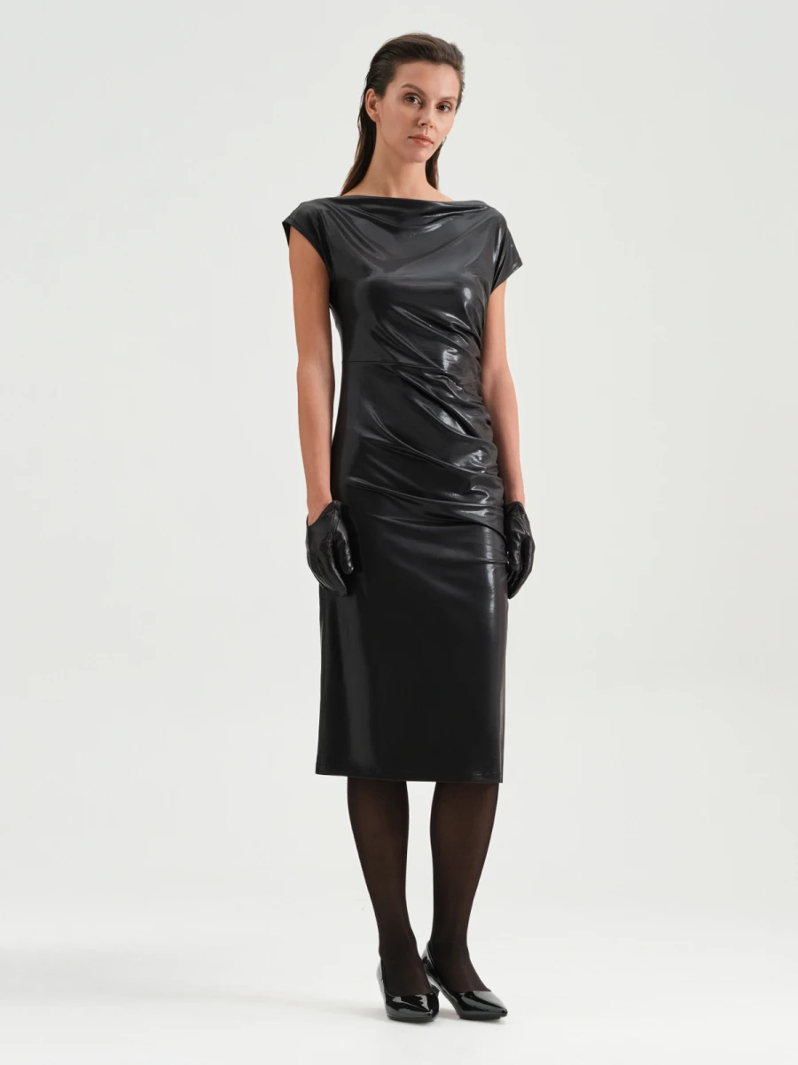 Такой нестандартный подход к выбору базового черного платья точно не останется без внимания. Драпировка в модном союзе с гладкой блестящей тканью создают впечатление «второй кожи». Длина миди добавляет образу элегантности, а боковой разрез до середины бедра подчеркивает красоту ног и уверенность в каждом шаге. Платье выигрышно сядет на любой тип фигуры благодаря особенностям кроя.