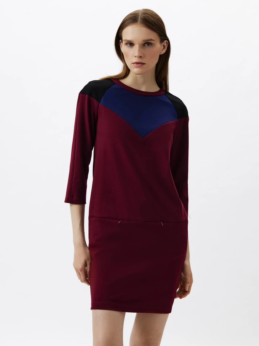 Трикотажное платье прямого кроя длины мини бордового цвета с синей и черными вставками и рукавами 3/4. Отлично подойдет для создания повседневных образов в сочетании с кедами или кроссовками.