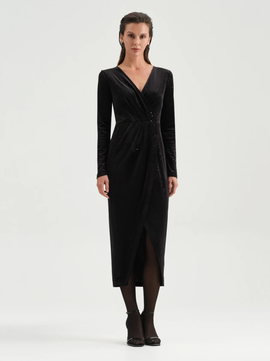 В таком платье невозможно остаться незамеченной. Оно представляет собой гармоничное сочетание современной моды и изысканной женственности, подчеркивая индивидуальный стиль и харизму его обладательницы. Глубокий V-образный вырез подчеркивает красоту шеи, а блестящая люрексная нить делает платье идеальным вариантом для праздничного вечера. Модель имеет длину миди, выполнена в классическом черном цвете.
