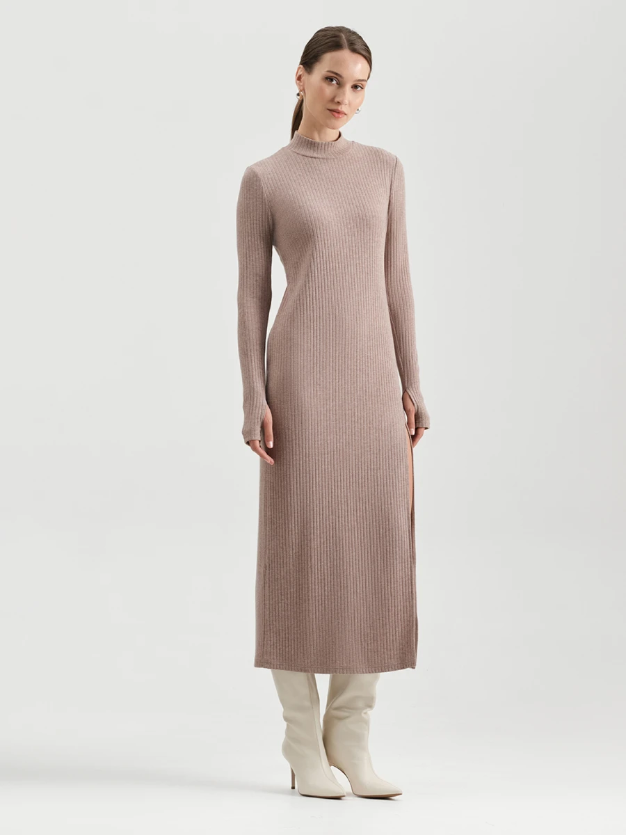 Однотонное бежевое платье из мягкого трикотажа - идеальный вариант для уютных и стильных образов в осенне-зимний период. Модель полуприлегающего кроя отлично сядет на любой тип фигуры и подчеркнет ее достоинства. Комфортный воротник-стойка свободно ложится к шее и не сковывает движение. Сбоку проходит глубокий женственный разрез. Можно смело дополнять платье аксессуарами и создавать многослойные луки.