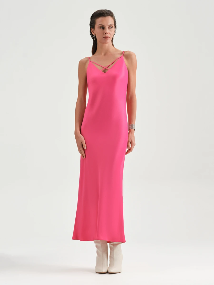 Лаконичное платье-комбинация в длине миди - беспроигрышный вариант на любое событие. Данная модель представлена в насыщенном розовом оттенке и выполнена из плотной сатиновой ткани. Благодаря премиальному качеству материалов платье приятно ложится к телу, не теряет цвет после стирки и не просвечивает. А деликатный сатиновый блеск придает образу праздничный вид. Тонкие бретели оснащены механизмом для регулировки длины.
