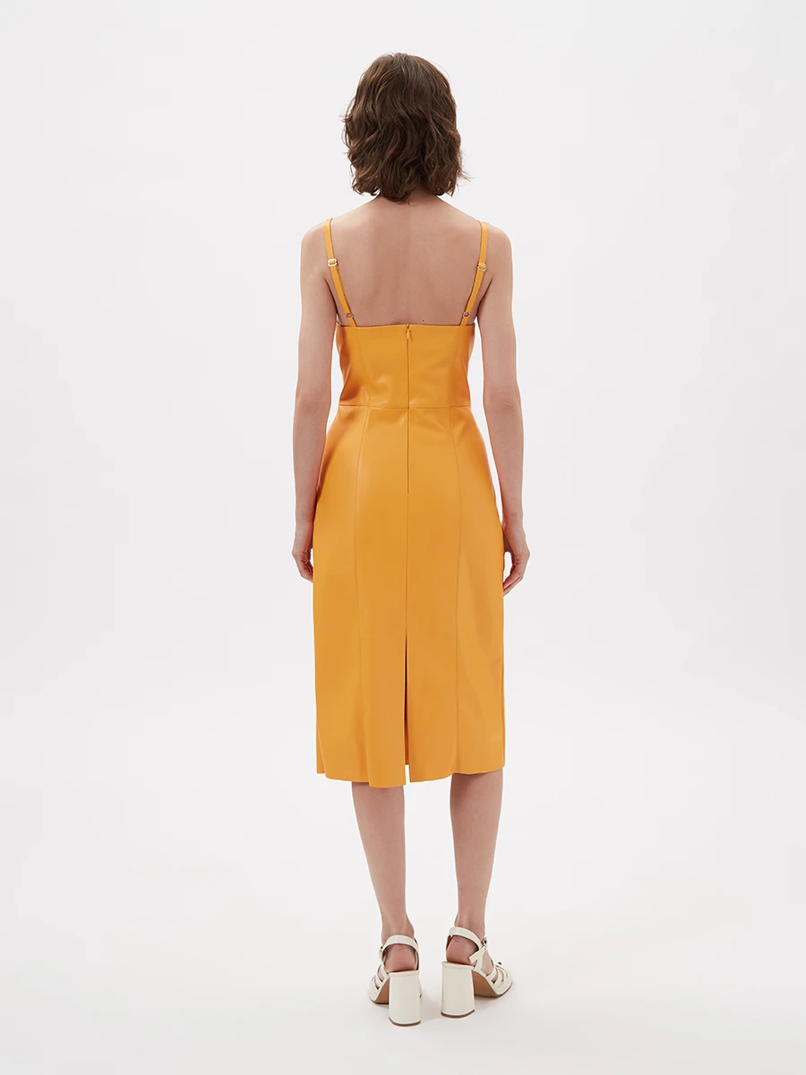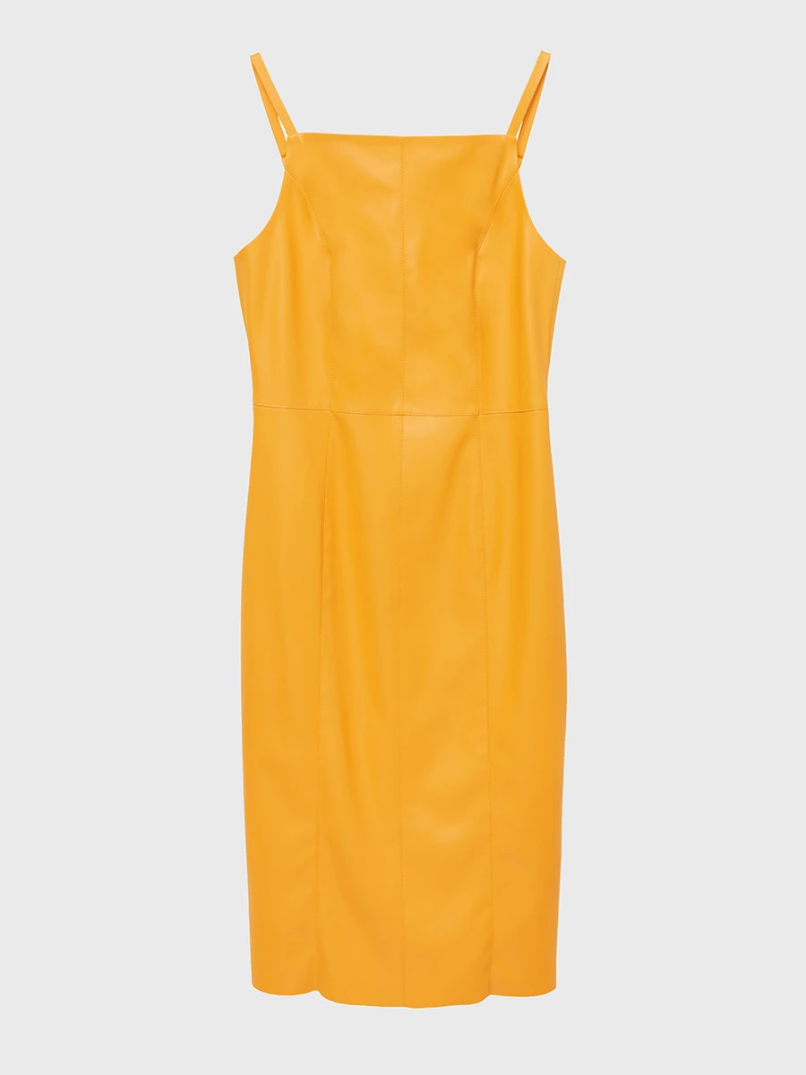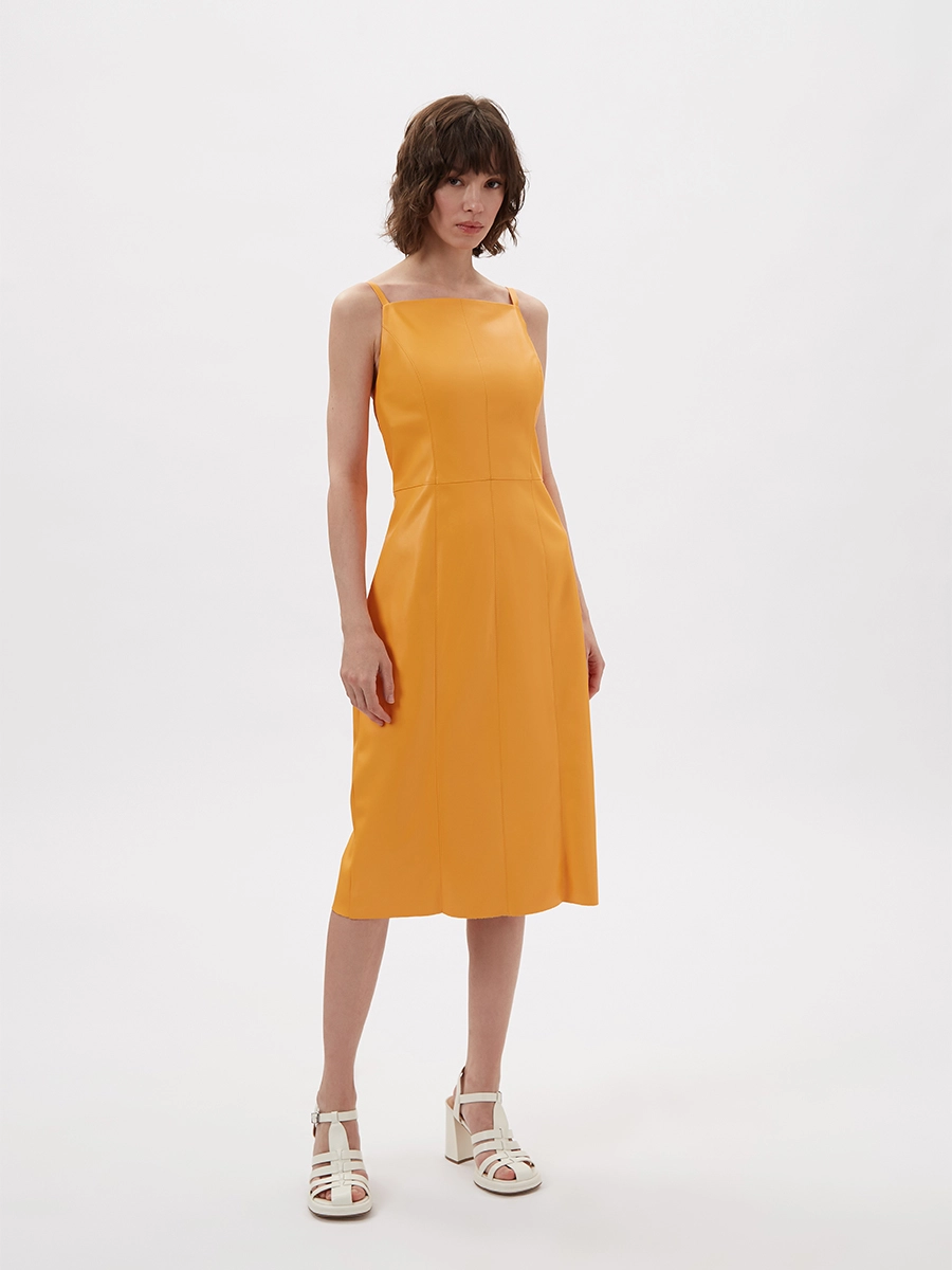 Сарафан из экокожи оранжевого цвета.