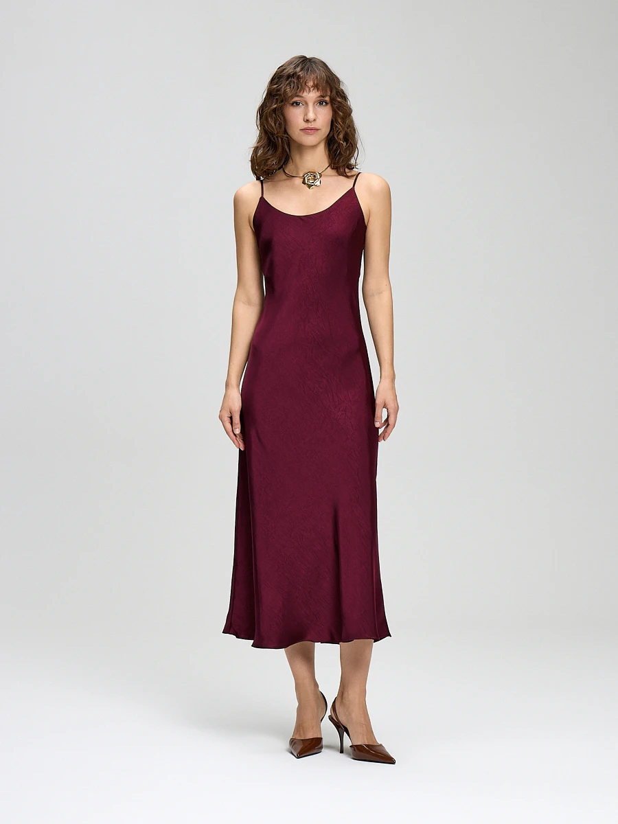 Платье-комбинация в благородном бордовом цвете — элегантная и лаконичная модель, вдохновлённая эстетикой минимализма. Свободный силуэт мягко скользит по фигуре, подчёркивая женственные линии, а круглый вырез и тонкие регулируемые бретели создают изящную и открытую линию плеч. Длина ниже колен придаёт образу утончённость, ткань имеет выразительный фактурный рисунок.