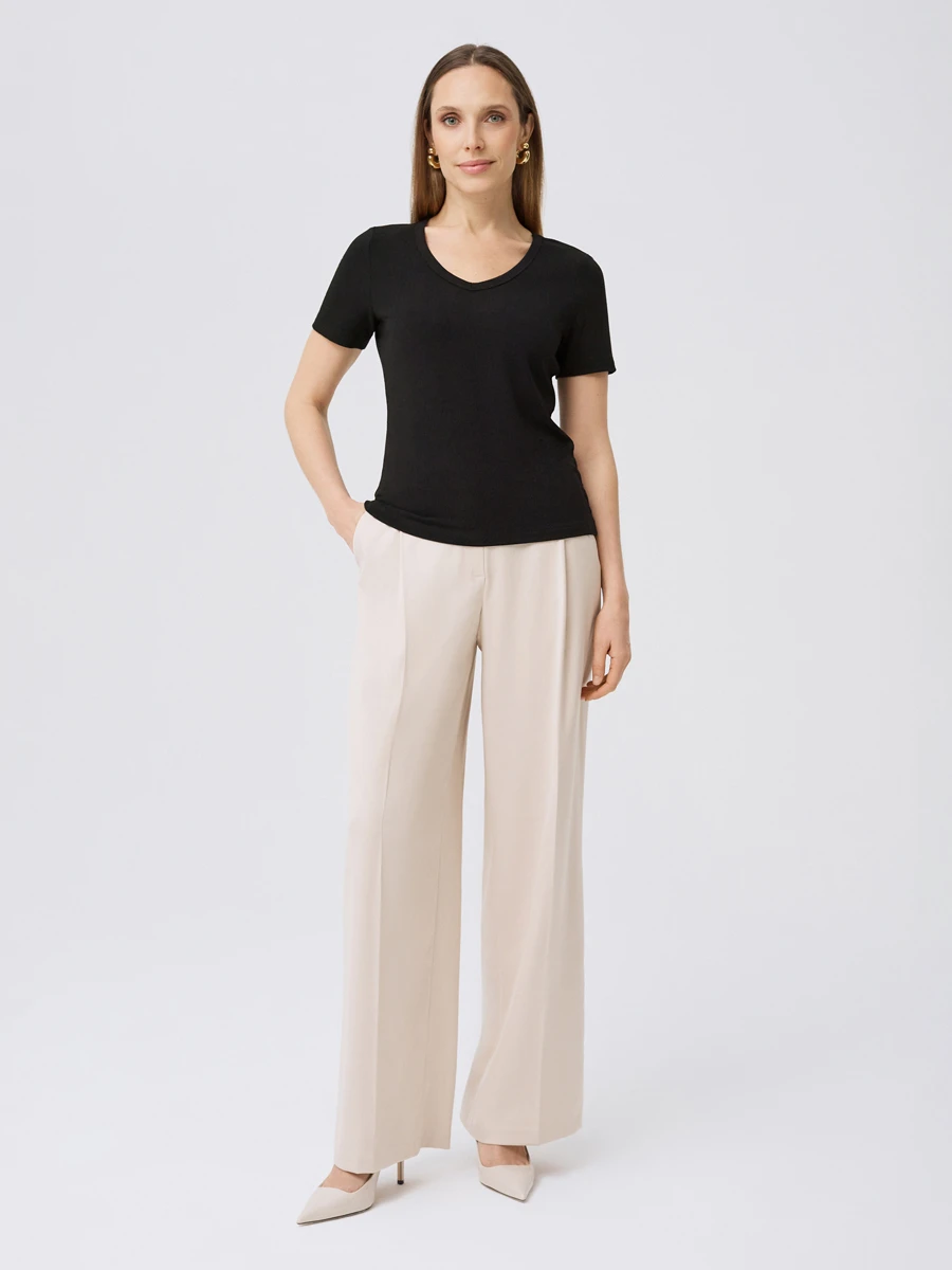 Базовая футболка черного цвета из трикотажа с добавлением вискозы. Силуэт приталенного кроя с V-образной горловиной и короткими рукавами.