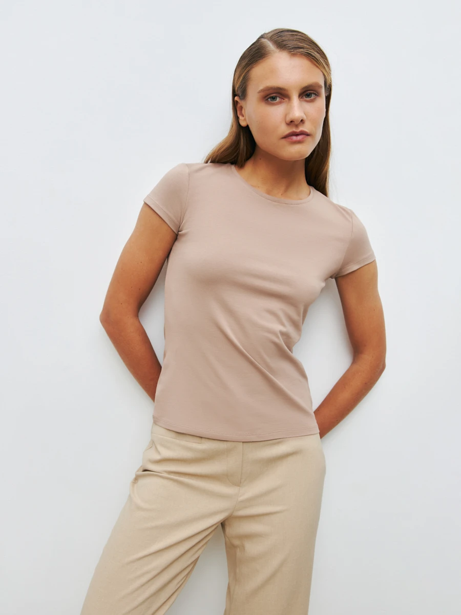 Лаконичная приталенная футболка с коротким рукавом базового оттенка легко впишется в любой стиль: от делового дресс-кода до экстравагантного китча. Приталенный силуэт подчеркивает нежные женственные изгибы, классический круглый вырез делает акцент на лице и шее. Соберите стильный образ в теплой песочной гамме: дополните футболку джинсами, юбкой или брюками из наших коллекций.