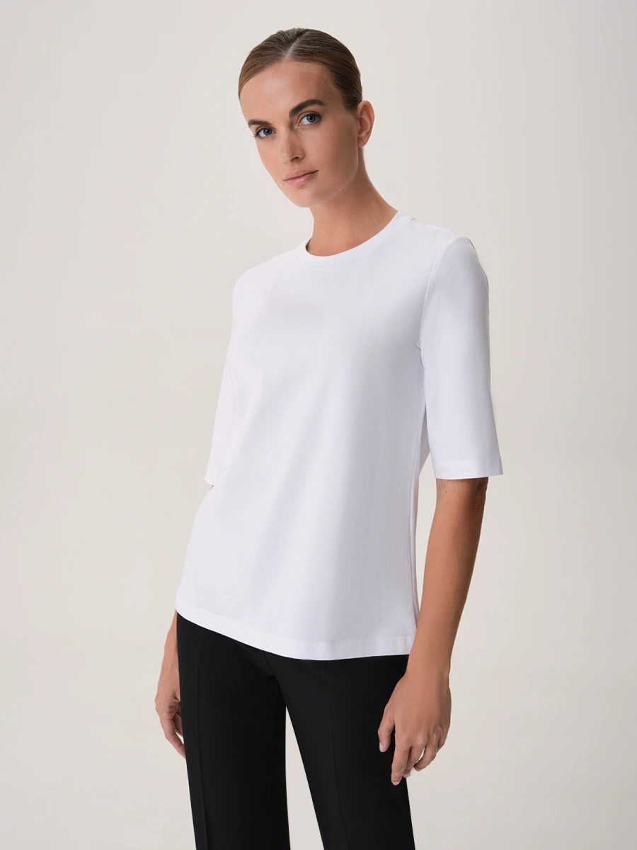 Однотонная белая футболка прямого свободного кроя - незаменимая база любого гардероба. Модель выполнена из мягкой хлопковой ткани премиального качества. Приятно ложится к телу и комфортно носится на протяжении всего дня. Отличительная особенность изделия - просторные рукава до локтя. Футболку можно использовать как самостоятельную единицу образа или в качестве нижнего слоя под объемные рубашки или жакеты.