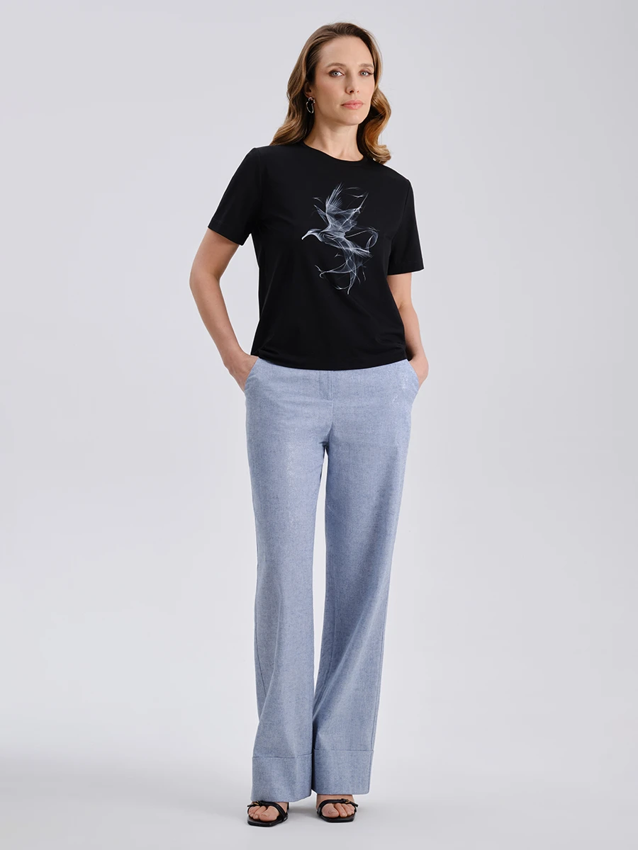 Черная футболка прямого кроя с лаконичным принтом и круглой горловиной. Выполнена из смесовой ткани из модала и хлопка. Ткань хорошо пропускает воздух, приятная на ощупь, и почти не мнется.