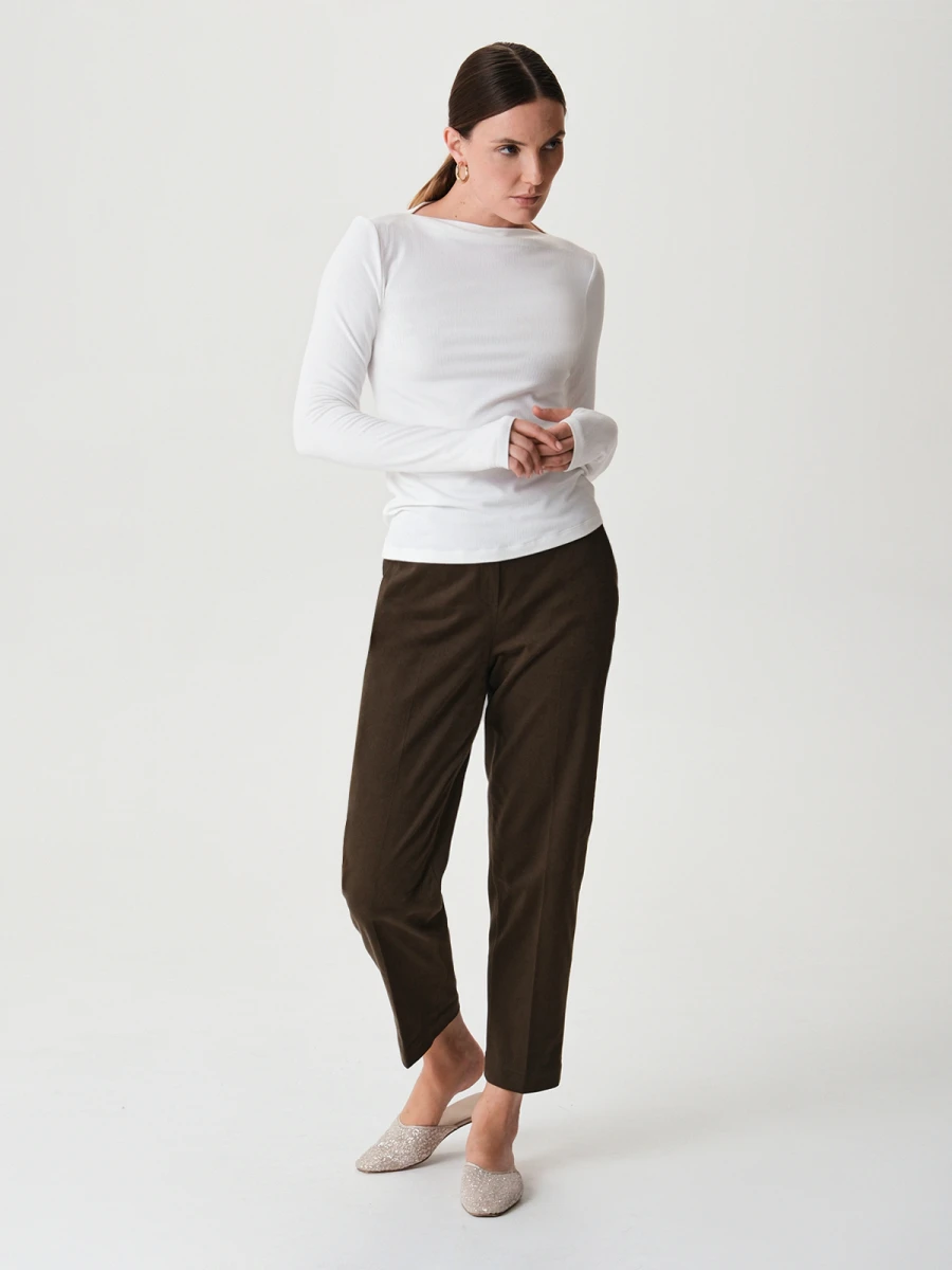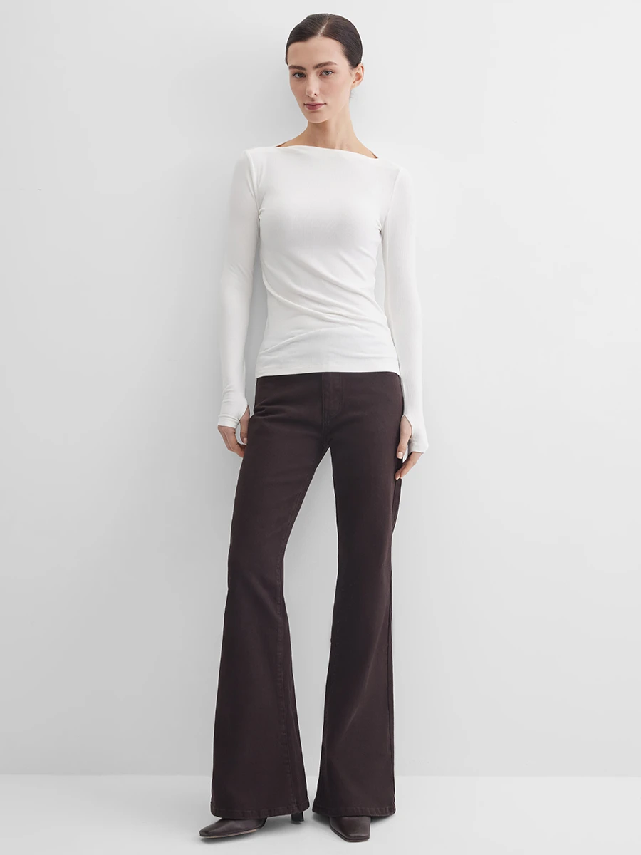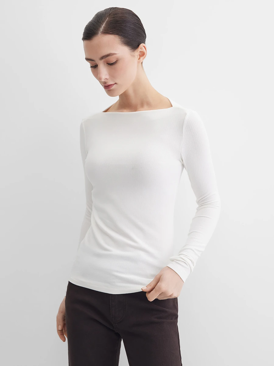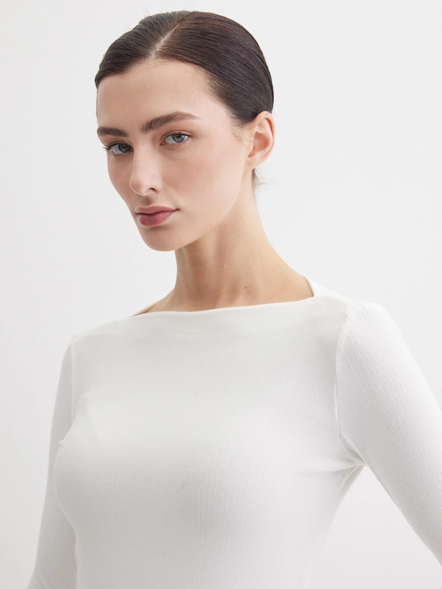 Приталенный лонгслив с актуальным вырезом "лодочка" из мягкого трикотажа "лапша" может стать основой как офисного или делового образа, так и повседневных или нарядных луков. Дополнительный акцент за счет рукавов с напуском и прорезью для пальца придает образу загадочности.