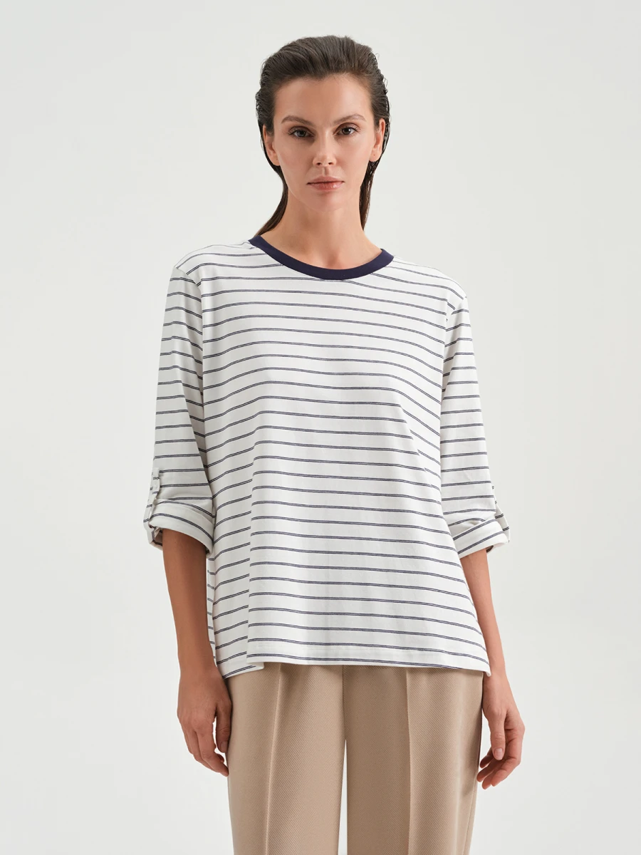 Молочный лонгслив в горизонтальную синюю полоску - это стильный и практичный вариант для повседневных образов. Мягкая трикотажная ткань премиального качества и актуальный oversize крой обеспечивают комфортную носку на протяжении всего дня. Акцентные разрезы в боковых швах наполняют образ деталями, а свободные укороченные рукава собираются по краям и застегиваются на пуговицы. Лонгслив с легкостью впишется в любой гардероб благодаря универсальному крою и базовым оттенкам.