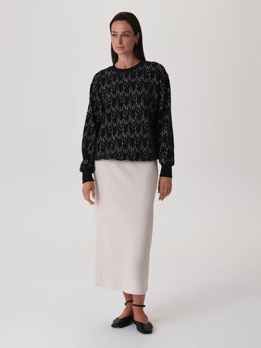 Милый oversize свитшот с белыми зайчиками идеально впишется в повседневные образы. Модель выполнена из плотной трикотажной ткани черного цвета, не линяет и не теряет насыщенность после стирки. Горловина, рукава и низ изделия оснащены эластичными вставками для максимального комфорта и защиты от прохладного ветра. Благодаря свободному крою свитшот можно носить поверх блуз и стилизовать многослойные луки.