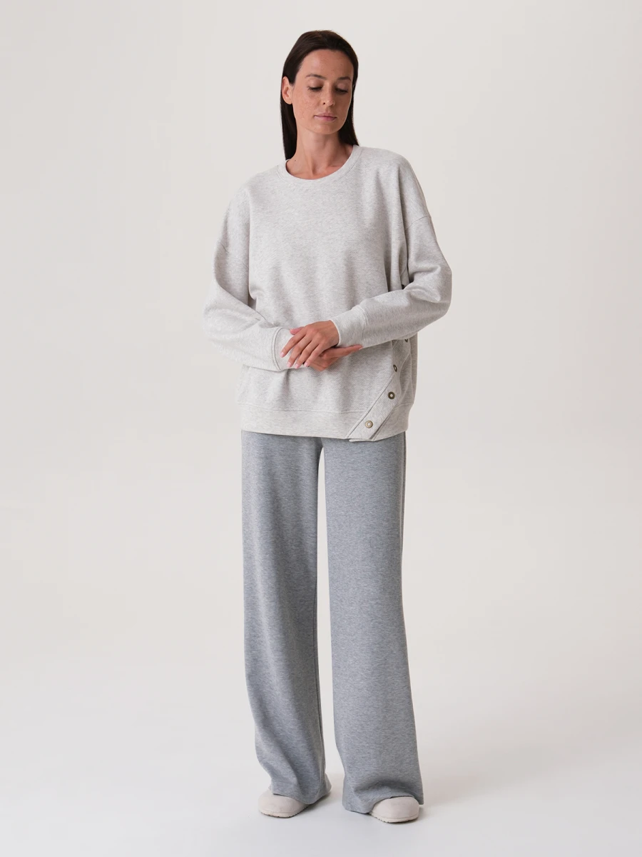 Oversize свитшот из мягкого трикотажа - то, что нужно для комфортных теплых образов. Данная модель представлена в спокойном светло-сером оттенке. Можно с легкостью интегрировать в повседневный образ и экспериментировать с актуальными цветовыми сочетаниями. Длинные свободные рукава оснащены эластичными манжетами, а по низу изделия проходит диагональный ряд декоративных пуговиц.