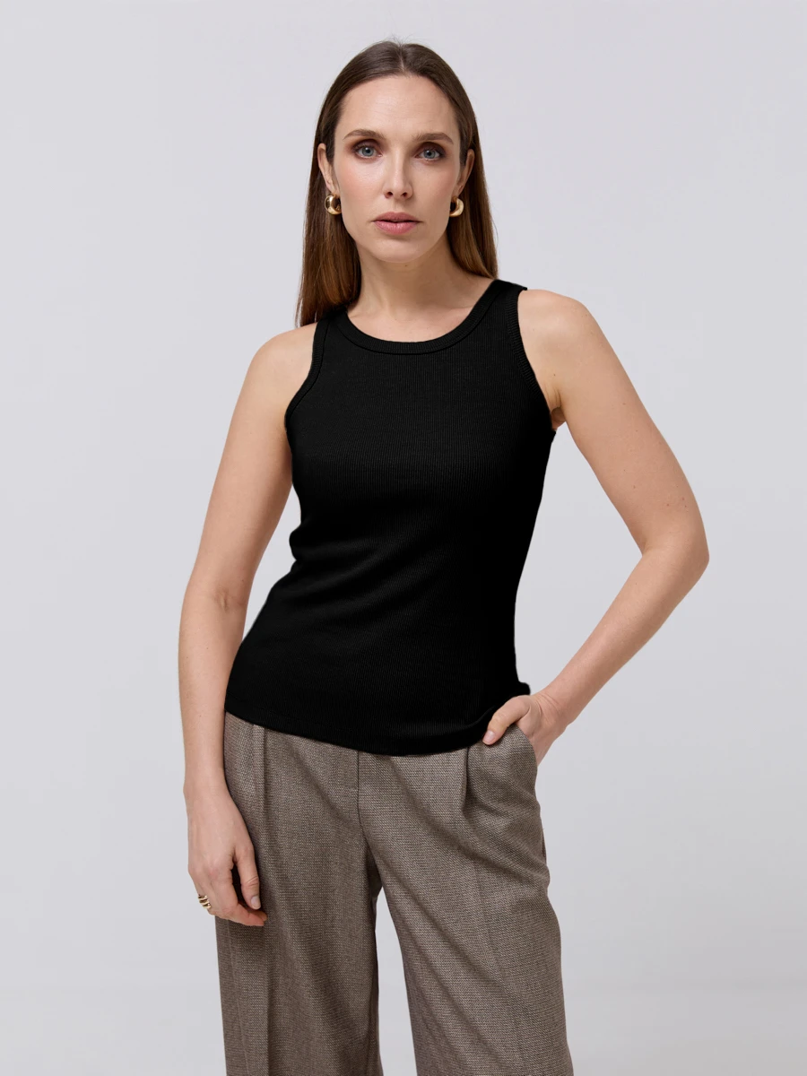 Черная базовая топ-майка прилегающего силуэта с круглой горловиной. Майка выполнена из смесового материала с добавлением вискозы.