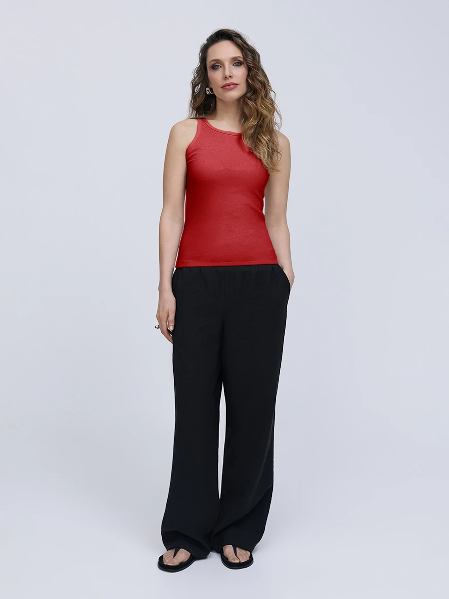 Бордовая топ-майка прилегающего силуэта с круглой горловиной. Майка выполнена из смесового материала с добавлением вискозы.
