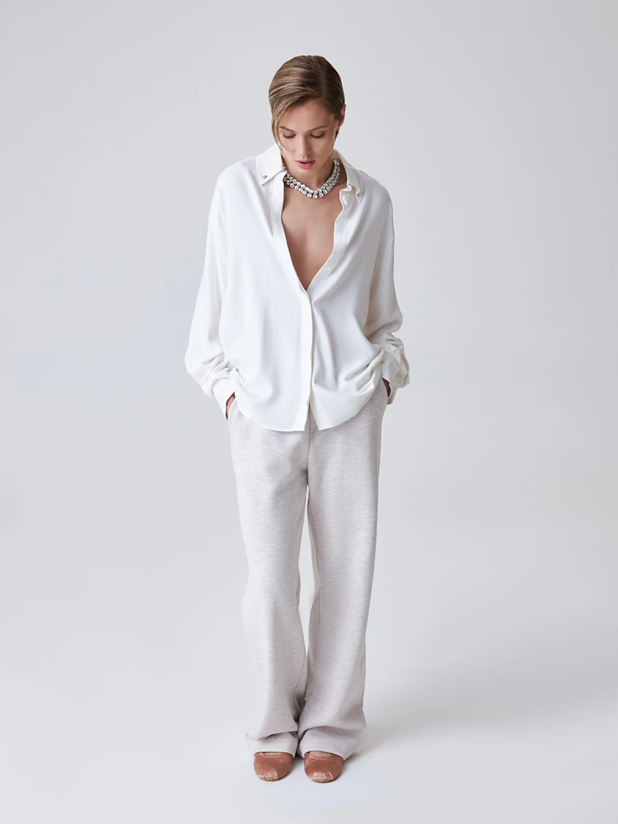 Свободные трикотажные брюки в спортивном стиле избавят Вас от постоянных мук при составлении повседневных образов. Универсальная модель цвета слоновой кости отлично сядет на любую фигуру благодаря особенностям кроя. Анатомическая средняя посадка и пояс на резинке обеспечивают максимальный комфорт и свободу в движении. Полная длина и прямой крой визуально удлиняют силуэт, а спереди имеются вместительные карманы.