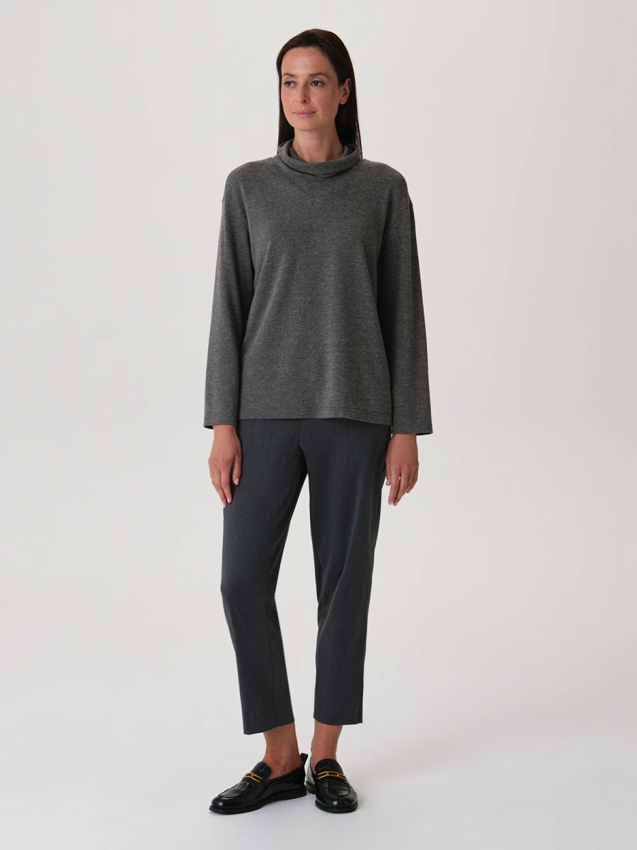 Базовая свободная водолазка в спокойном сером оттенке из мягкого трикотажа. Модель отлично впишется в уютные осенние-зимние образы. Плотная эластичная ткань приятно ложится к телу и благодаря особенностям кроя обеспечивает максимальный комфорт при носке. Данное изделие просто идеальный вариант для тех, кто не любит ощущение скованности. Высокий воротник со сборками свободно ложится к шее, а длинные объемные рукава прикрывают запястья.