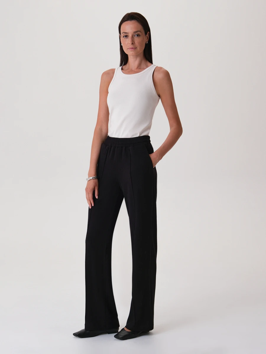 Базовые трикотажные брюки прямого кроя в универсальном черном цвете. Данная модель сочетает в себе стиль и комфорт. Широкий пояс на высокой посадке оснащен эластичной резинкой с деликатной степенью натяжения. Спереди имеются вместительные функциональные карманы и простроченные вертикальные стрелки. Брюки отлично сочетаются как с тонкими лонгсливами и топами, так и с объемными свитерами. Идеальный вариант для уютных повседневных образов.