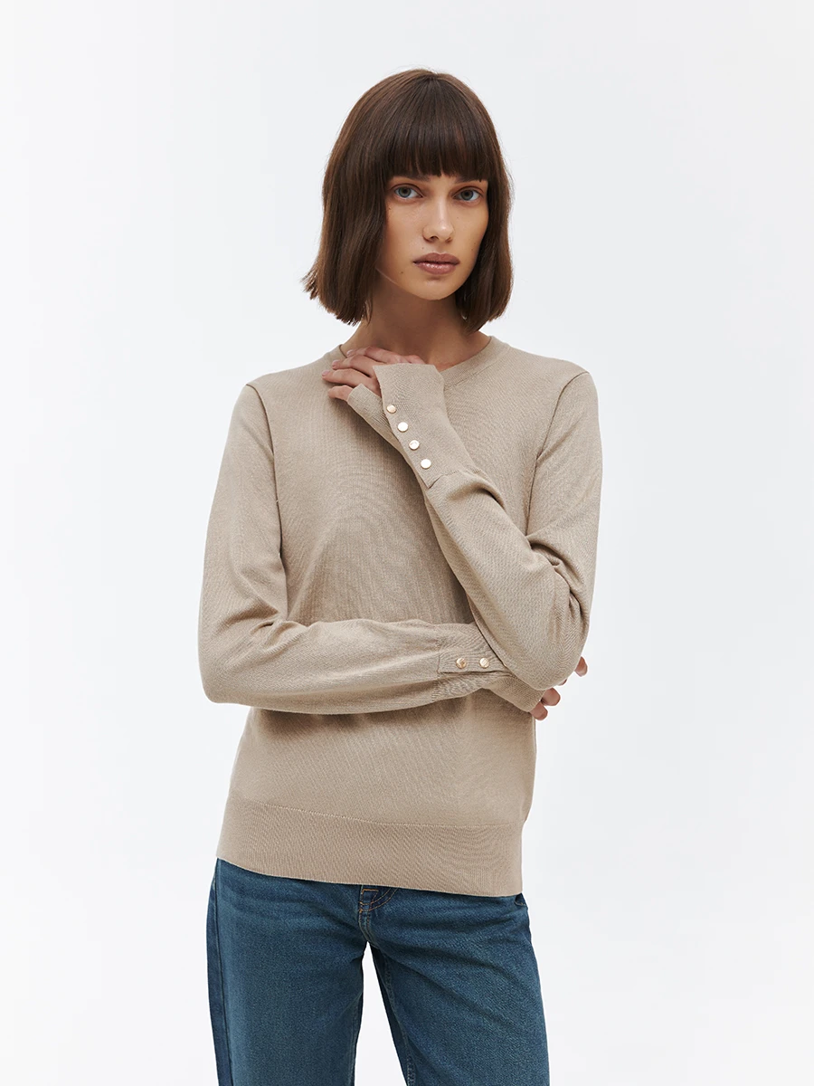 Однотонный трикотажный джемпер в бежевом цвете. Модель прилагающего кроя, имеет круглый вырез и эластичные вставки на горловине и по низу. Широкие манжеты сужаются к запястьям и застегиваются на круглые золотые пуговицы. Благодаря лаконичному дизайну изделие с легкостью впишется в любой гардероб и поможет в составлении стильных повседневных образов на работу или учёбу.