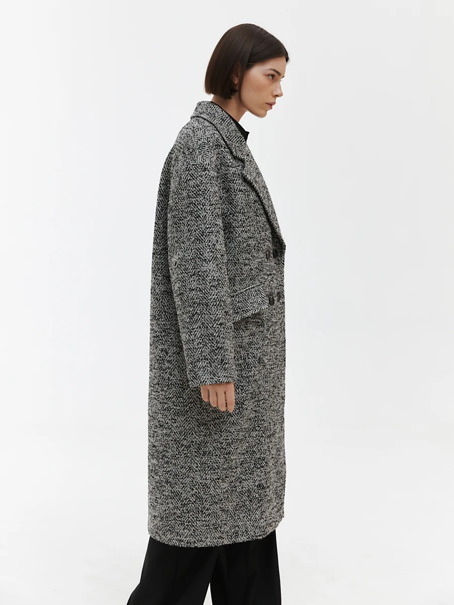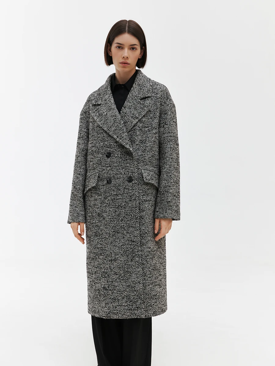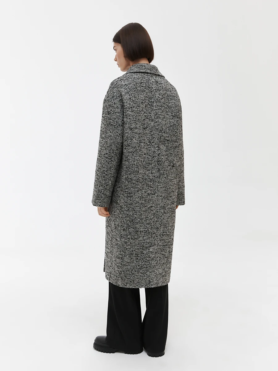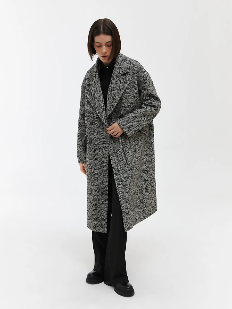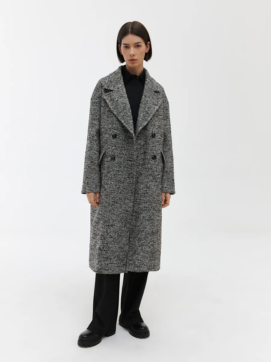 Длинное двубортное пальто - самый универсальный и практичный вариант на осень. Данная модель выполнена из плотной ткани в неоднородную светло-серую рябь. Прямой свободный крой позволяет носить пальто поверх объемных вязаных свитеров и трикотажных лонгсливов. Застегивается на крупные круглые пуговицы черного цвета, спереди имеются функциональные карманы с прямоугольными клапанами.